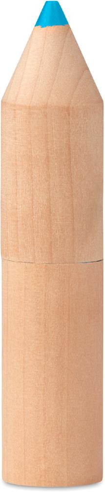 6 Buntstifte in einer runden Box aus Holz in Form eines Stiftes.