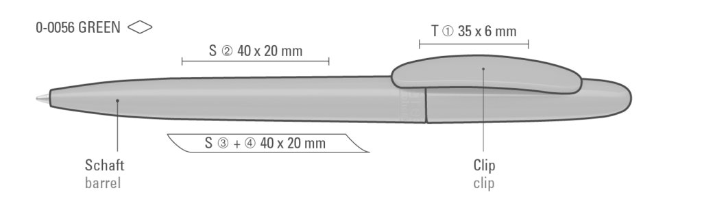Druckbereich: In Clipverlängerung 40mm x 20mm Siebdruck (S), auf dem Clip 35mm x 6mm Tampondruck (T), seitlich vom Clip 40mm x 20mm Siebdruck (S), gegenüber vom Clip 40mm x 20mm Siebdruck (S)
