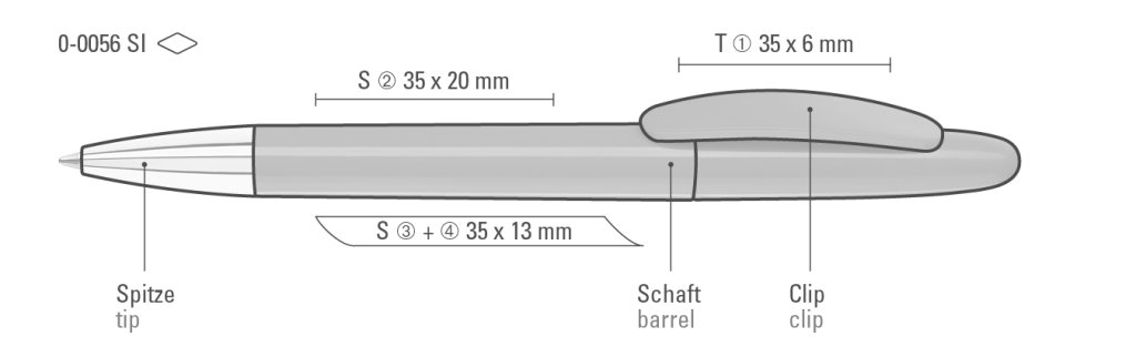 Druckbereich: Auf dem Clip 35mm x 6mm Tampondruck (T), in Clipverlängerung 35mm x 20mm Siebdruck (S), gegenüber vom Clip 35mm x 13mm Siebdruck (S), seitlich vom Clip 35mm x 13mm Siebdruck (S)