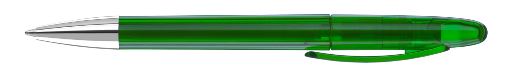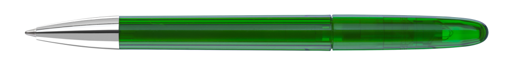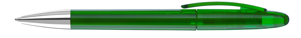 Drehkugelschreiber mit transparent glänzendem Gehäuse und Spitze glanzverchromt.