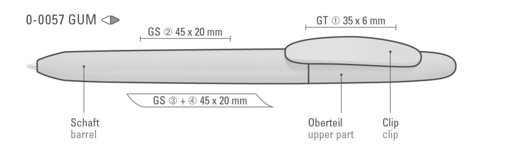 Druckbereich: Auf dem Clip 35mm x 6mm Tampondruck (GT), in Clipverlängerung 45mm x 20mm Siebdruck (GS), gegenüber vom Clip 45mm x 20mm Siebdruck (GS), seitlich vom Clip 45mm x 20mm Siebdruck (GS)
