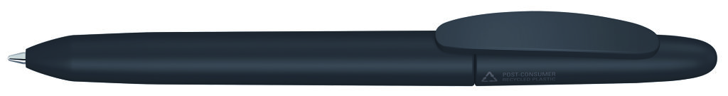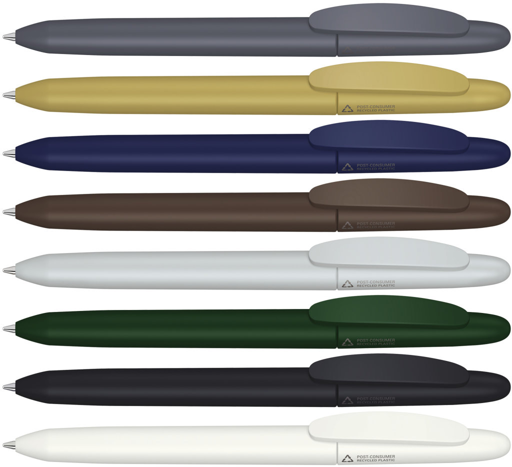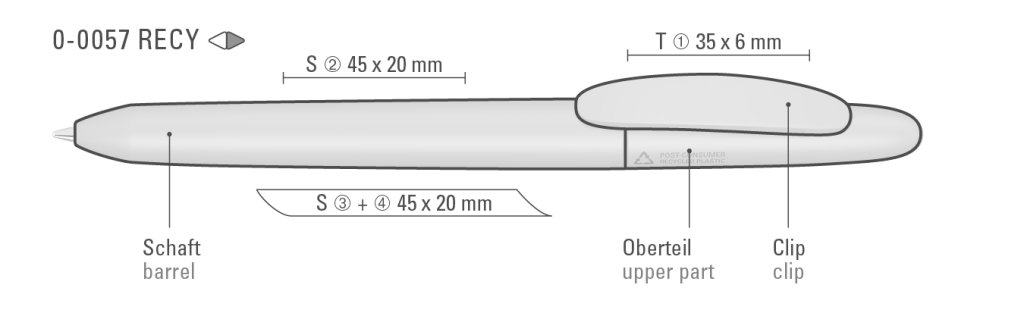 Druckkugelschreiber mit gedeckt mattem Kunststoffgehäuse aus 100% recyceltem Post-Consumer-Kunststoff, glänzendem Bogenclip und Drücker. Das Modell ist mit dem Recyclingzeichen gekennzeichnet. Drücker optional in verschiedenen gedeckt glänzenden Farben (Standard ABS) erhältlich. Aufgrund der Besonderheit des Materials (Post-Consumer Recycled Plastic) sind produktionstechnische Farbschwankungen gegeben.Druckbereich: Auf dem Clip 30mm x 7mm Tampondruck (T), in Clipverlängerung 50mm x 20mm Siebdruck (S), seitlich vom Clip 60mm x 13mm Siebdruck (S), gegenüber vom Clip 60mm x 13mm Siebdruck (S)