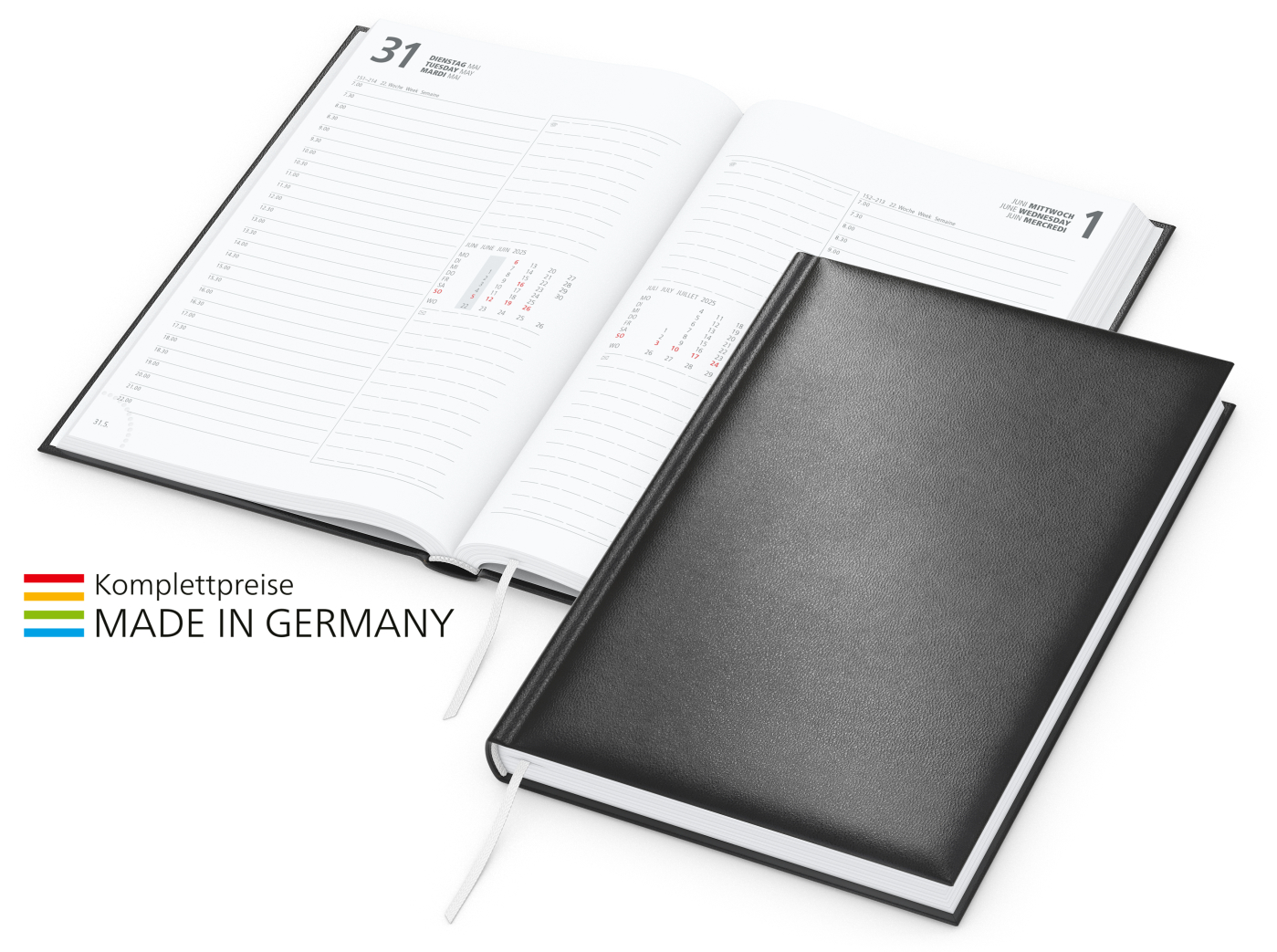 Der Buchkalender, mit dem man garantiert nichts falsch macht: Kalendarium mit roten Akzenten und praktischem Informationsteil. Einband in Dunkelblau oder Schwarz.