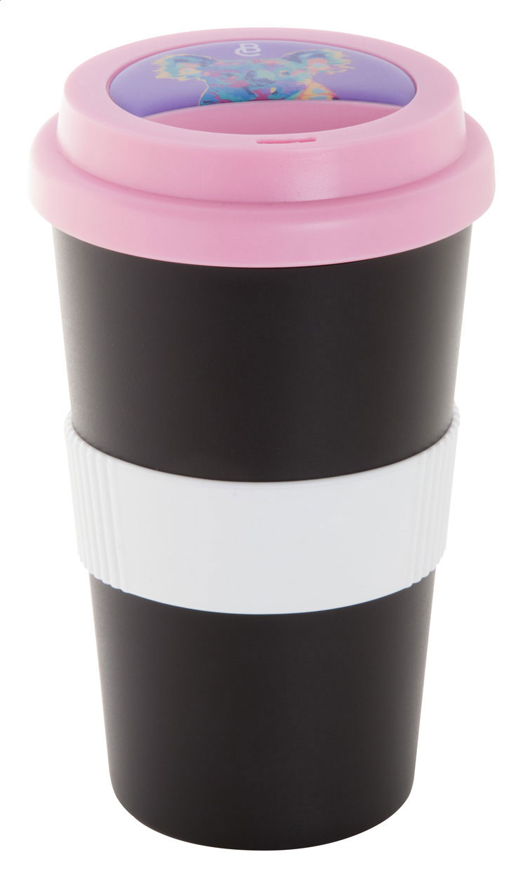 Individualisierbarer, doppelwandiger Thermobecher aus Kunststoff mit Trinkdeckel und Silikongriff. Füllmenge: 400 ml. Mindestbestellmenge: 50 Stück.