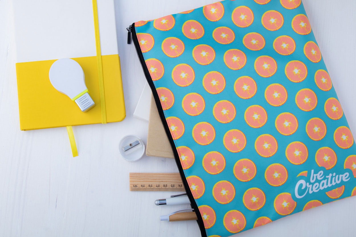 Individuelle Dokumentenmappe, mit Reißverschluss aus Polyester. Größe A4. Der Preis ist inkl. vollflächigem Sublimationsdruck. Mindestmenge: 25 Stk.