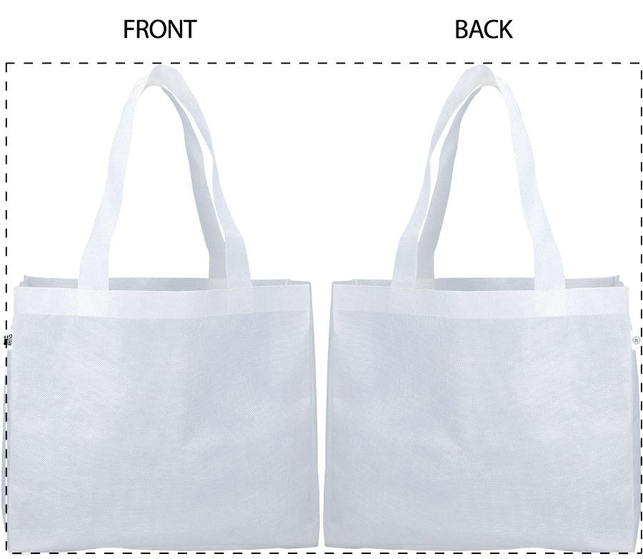 Individuelle Einkaufstasche aus RPET Non-Woven (80 g/m²) mit Seitenfalte und langen Henkeln. Der Preis ist inkl. vollflächigem Sublimationsdruck auf beiden Seiten. Mindestmenge: 25 Stk. Mit RPET-Label.