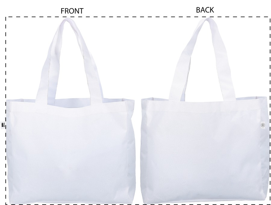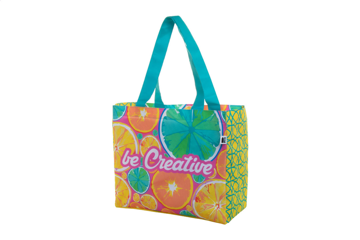 Individuelle Einkaufstasche aus 600D RPET Polyester mit Zwickel, langen Henkeln, RPET-Label und All-Over Sublimationsdruck. Mindestmenge: 25 Stk.