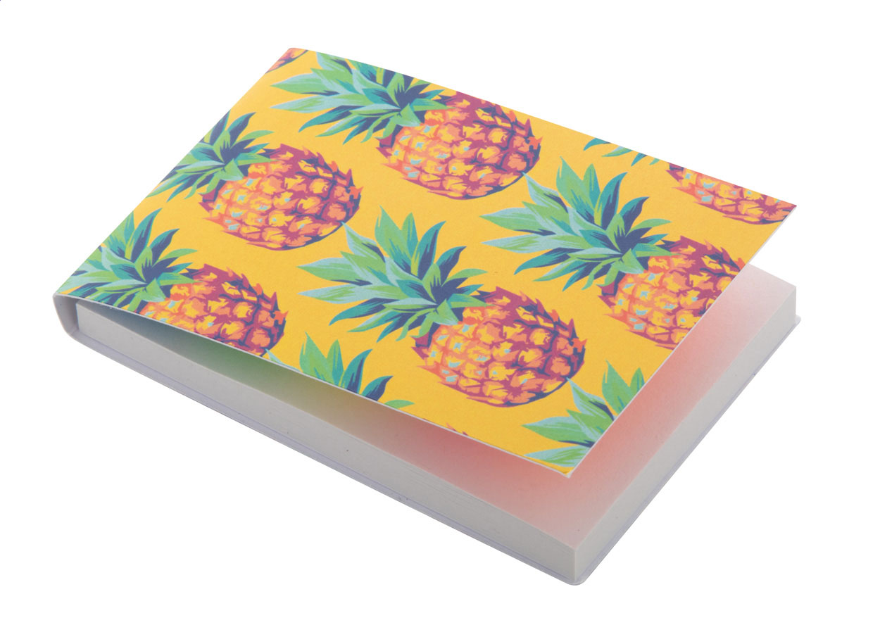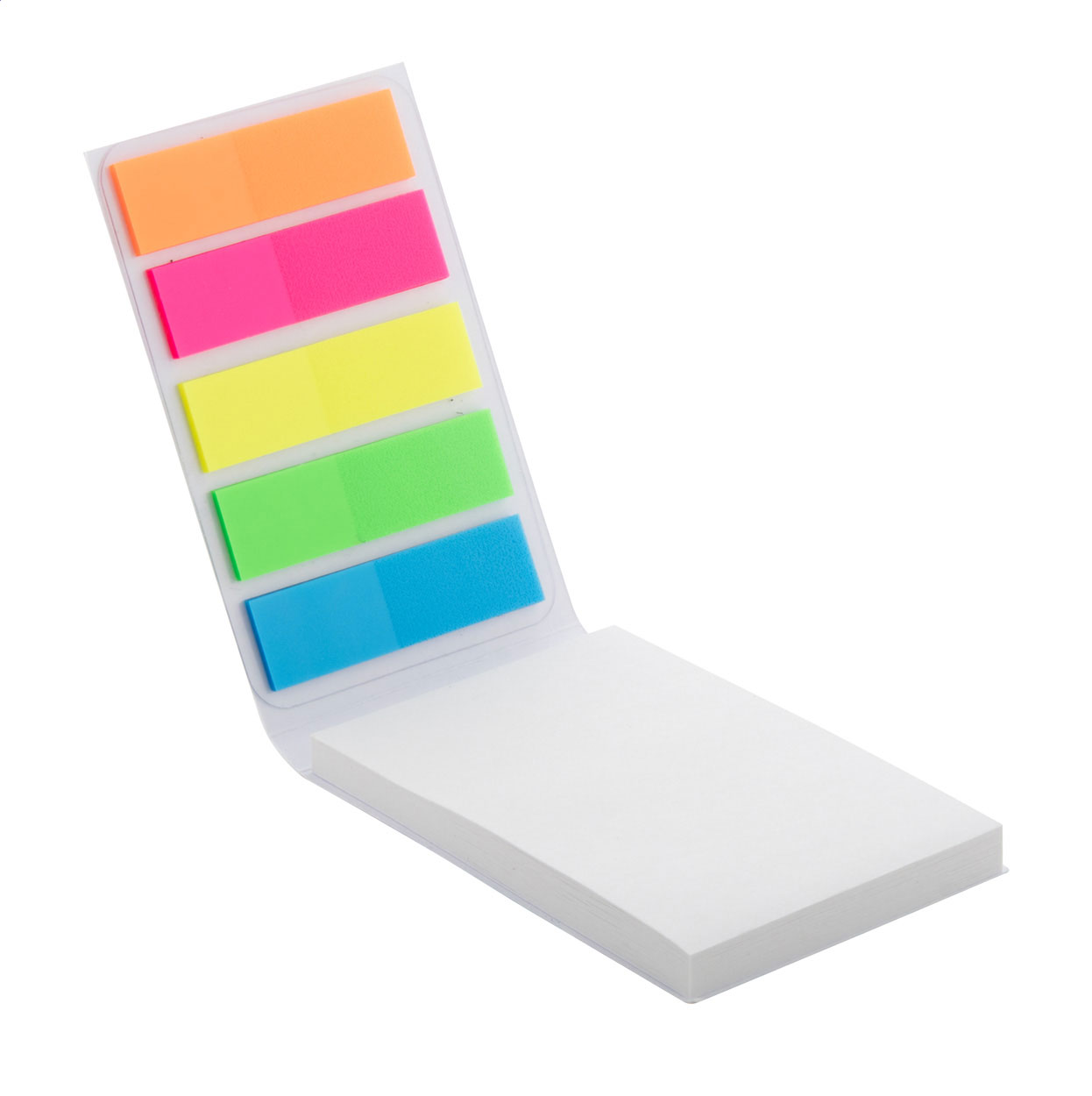 Individueller, mit Papier überzogener Haftnotizblock. Enthält 50 Blatt Haftnotizen aus Recyclingpapier (50 x 75 mm) und 100 Seitenmarkierungen aus Kunststofffolie in 5 verschiedenen Farben (44 x 12 mm). Der Preis beinhaltet eine vollfarbig bedruckte Außenhülle. Mindestbestellmenge: 100 Stk.