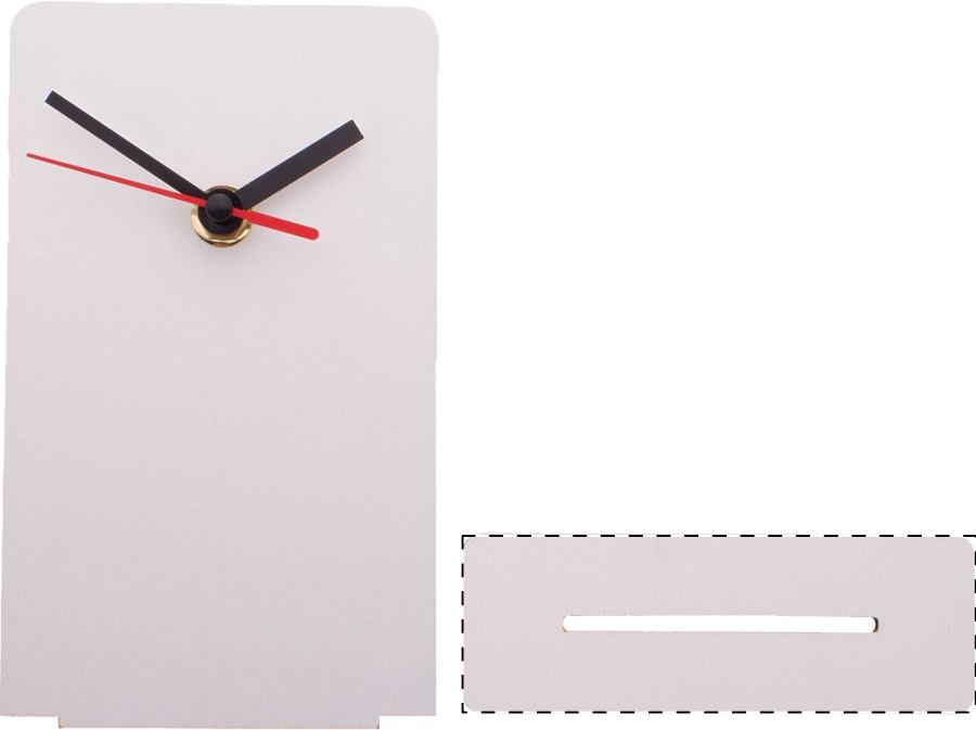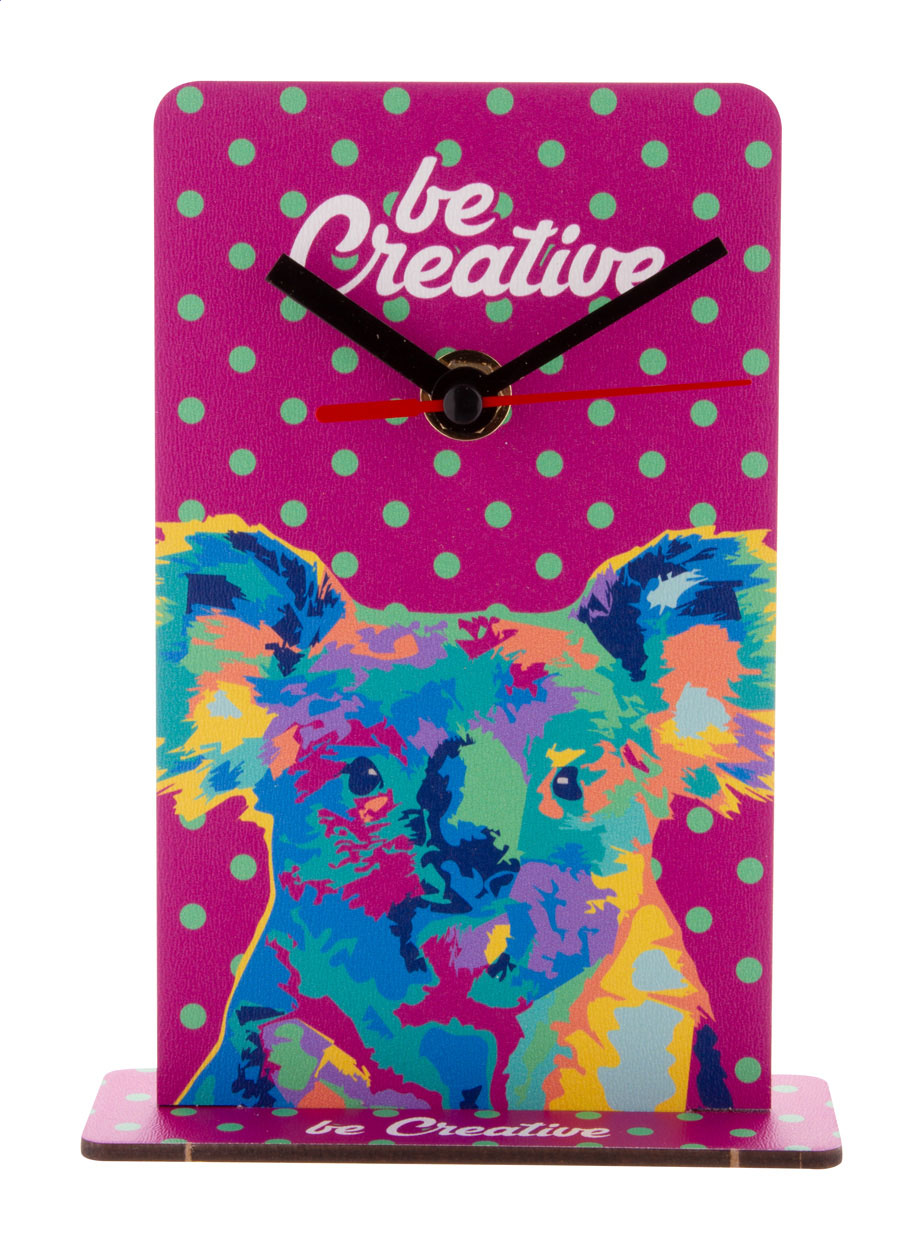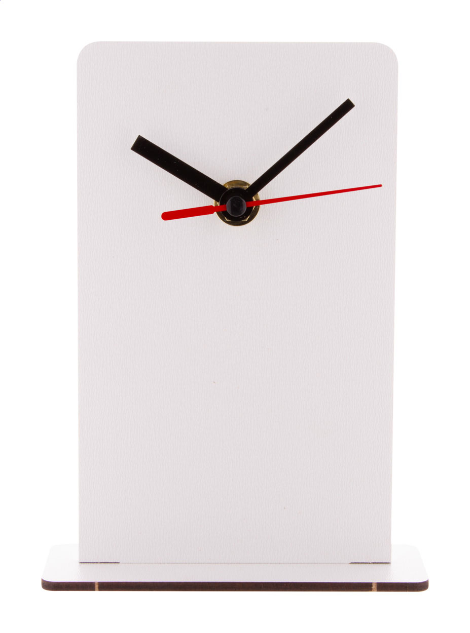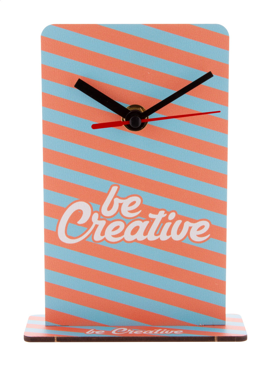 Tischuhr aus HDF-Holz mit Vollfarbdruck. Exkl. Batterie (1x AA). Mindestmenge: 50 Stk.