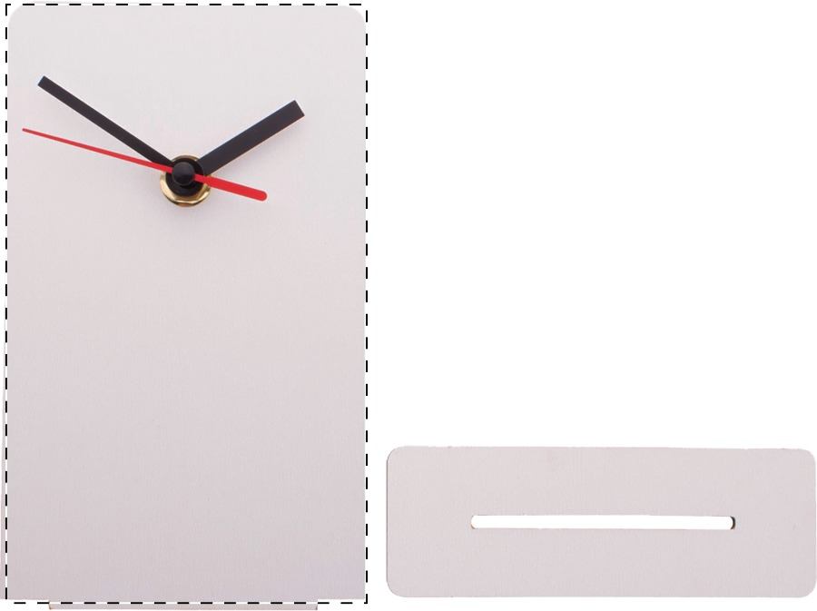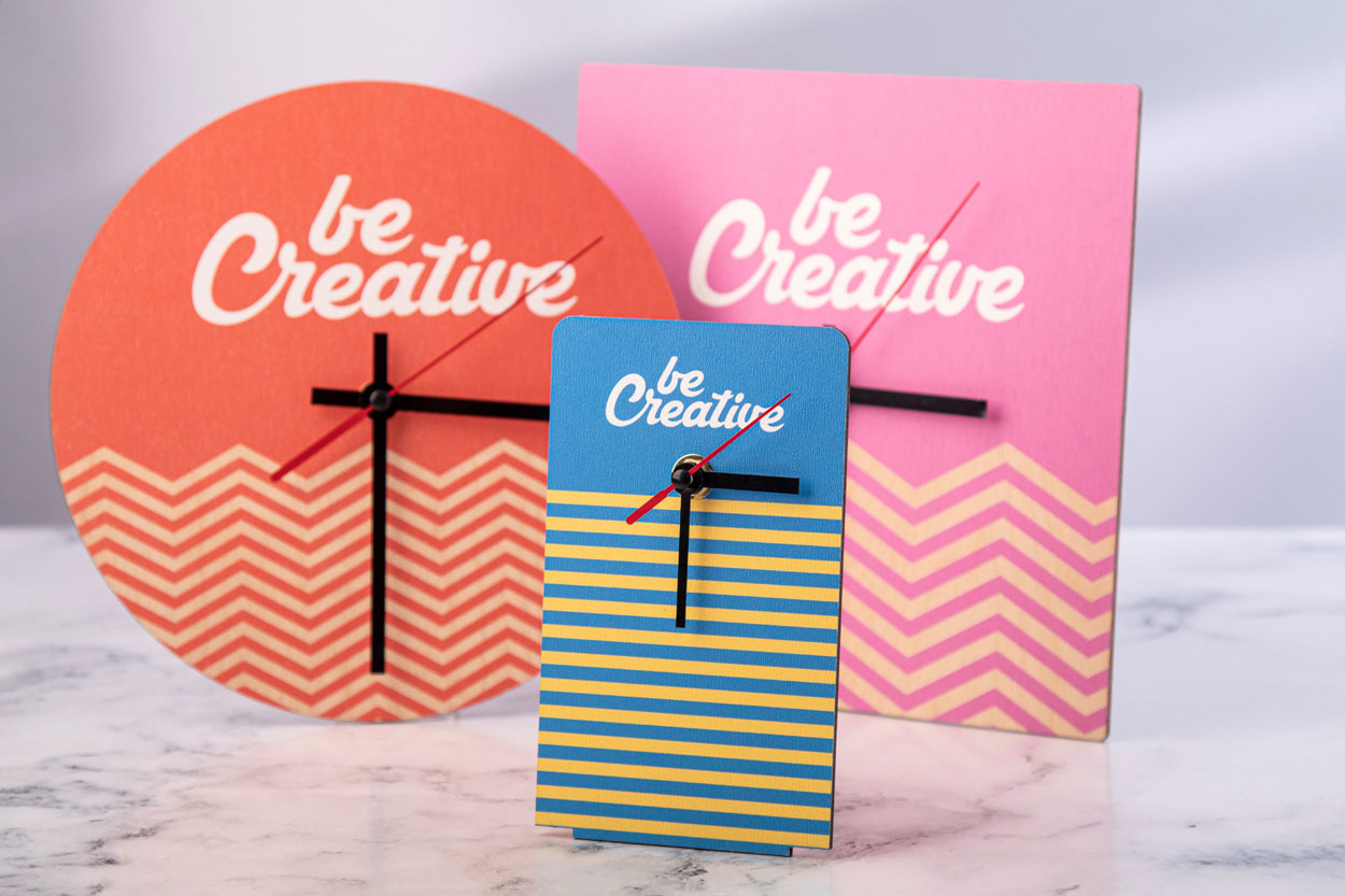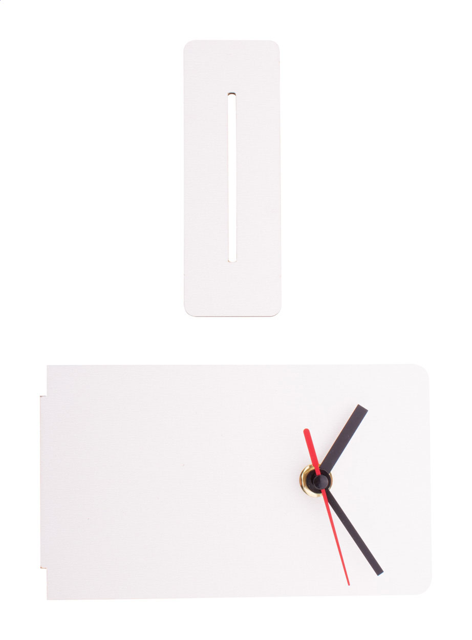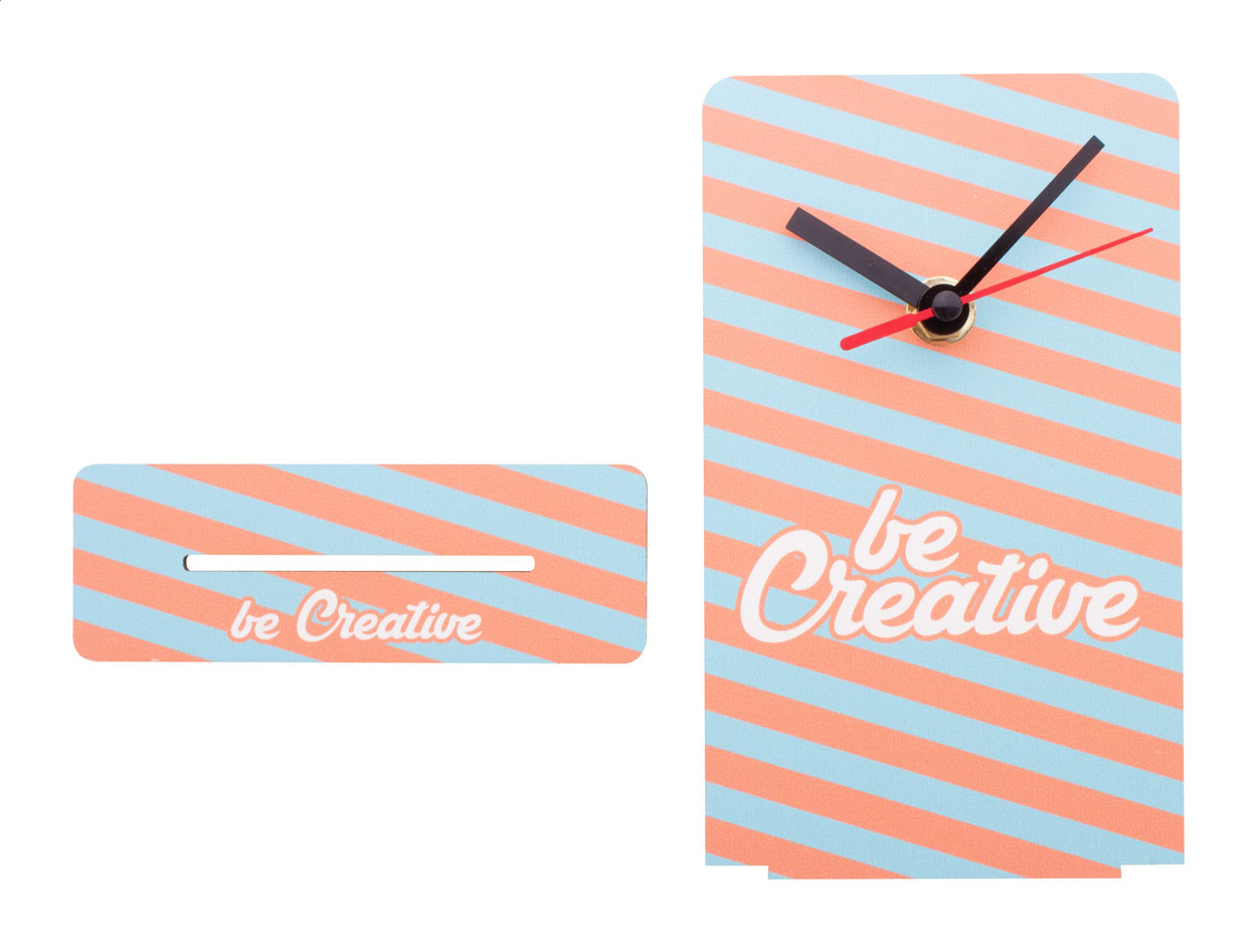 Tischuhr aus HDF-Holz mit Vollfarbdruck. Exkl. Batterie (1x AA). Mindestmenge: 50 Stk.