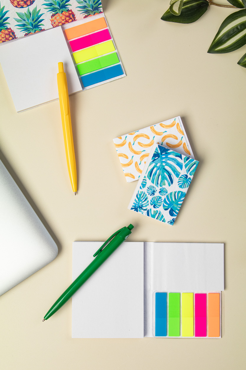 Kleiner, praktischer Alltagshelfer mit jeweils ca. 20 Haftnotizmarkern (ca. 50 x 15 mm) in 5 verschiedenen Farben. Besonders geeignetfür Mailings.Suchbegriffe: Haftnotizen, LesezeichenMaße: 80 x 59 x 3 mmGewicht: 9 gMaterial: PapierVeredelung: SiebdruckDruckcodes: S/A (4)Veredelung 1------------Platzierung: Vorderseite (1)Druckfläche: 60 x 35 mmDruckart: SiebdruckDruckgruppe, Druckcode: A, S/ADruckfarben max.: 4Farbe: beige