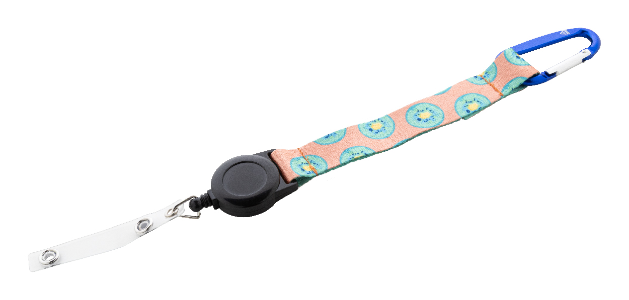 Individueller Schlüsselanhänger aus RPET-Polyester mit ausziehbarem Ausweishalter, Aluminiumkarabiner und Schlüsselring aus Metall. Preis inkl. Sublimationsdruck auf beiden Seiten sowie RPET-Label. Mindestmenge: 100 Stk.