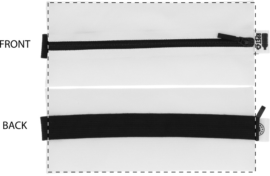 Individuelles Stifteetui mit Reißverschluss aus 600D RPET-Polyester mit Gummiband zur Befestigung an einem Notizbuchumschlag. Mit vollflächigem Sublimationsdruck. Mit RPET-Label. Mindestmenge: 50 Stk.