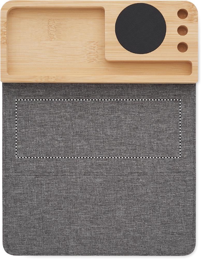 Schreibtisch-Organizer mit induktiver Ladestation aus Bambus. Smartphone-Halterung, Stifthalter und faltbares RPET-Mousepad. Ausgang: DC 9V/1.67A (15W). Kompatibel mit allen QI-fähigen Geräten wie den neuesten Androiden, iPhone® 8, X und neueren.