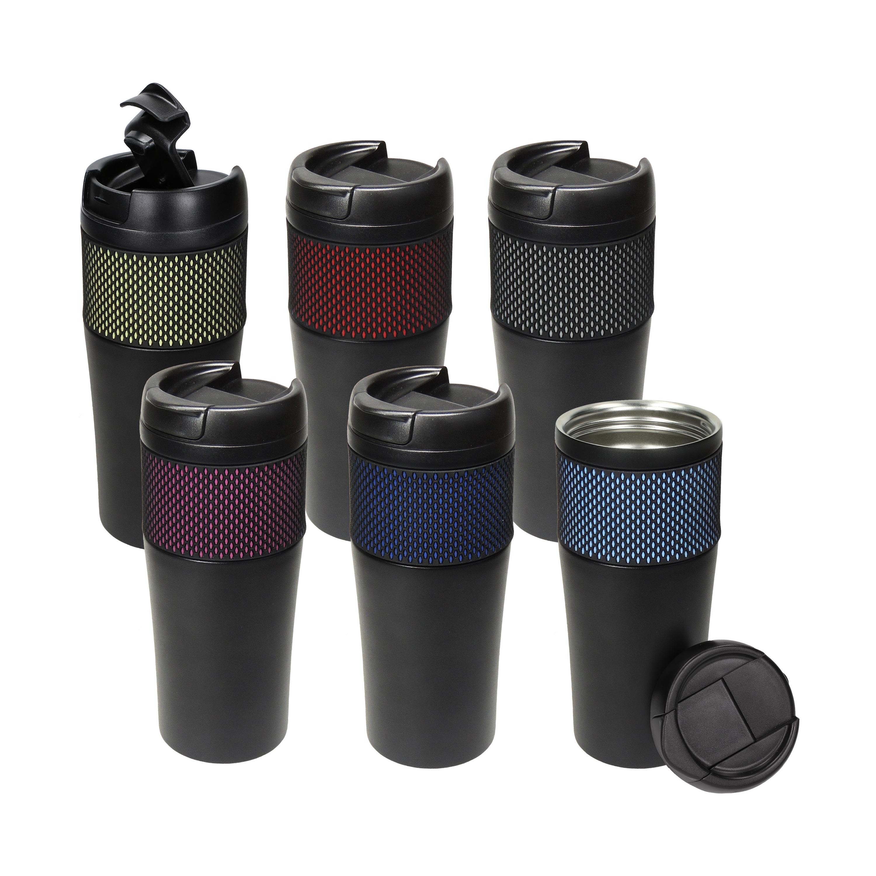 Sehr hochwertiger Isolierbecher mit grauer Manschette aus Silikon. Becher ist vakuum-isoliert und hält somit die Temperatur der Getränke länger konstant. Mit einem Schraubdeckel aus PP und einer verschließbaren Trinköffnung. Füllmenge: ca. 0,5 Liter.