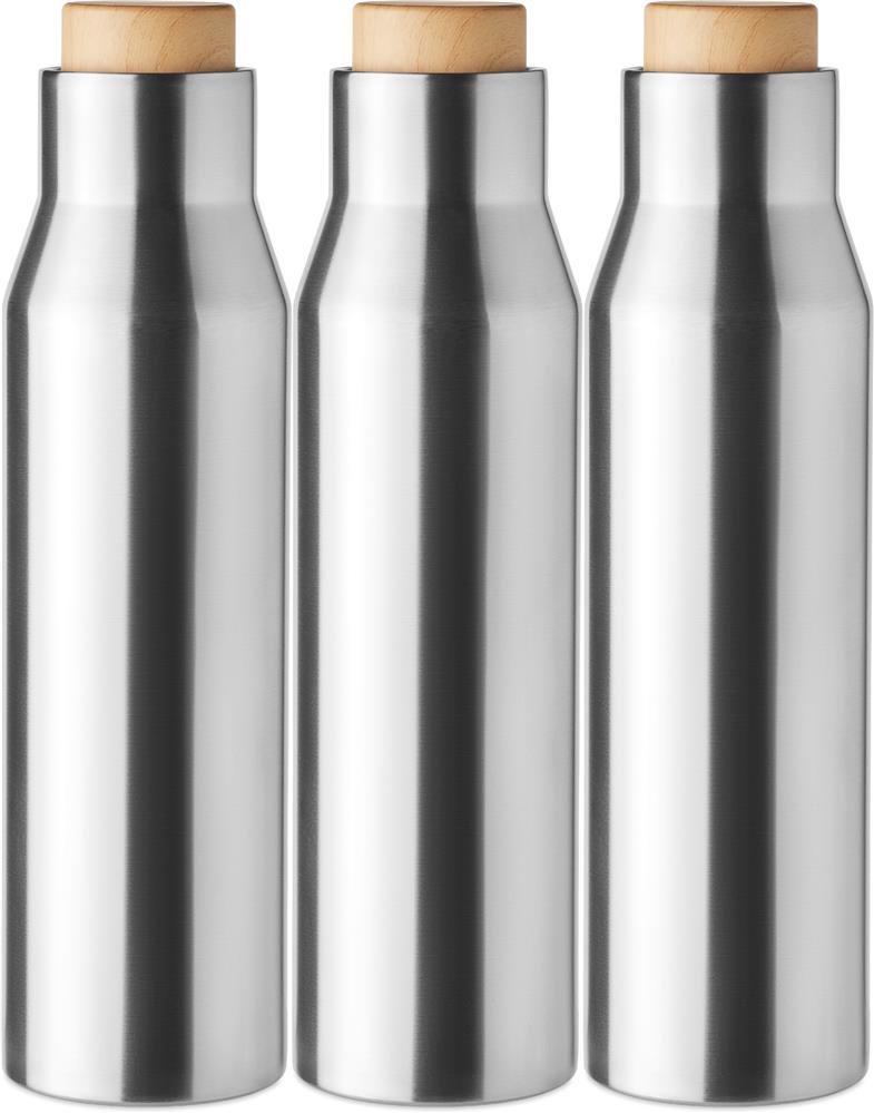 Doppelwandige Isolierflasche aus Edelstahl. Verschluss aus Bambus- Imitat. Füllmenge: 500 ml. Auslaufsicher.