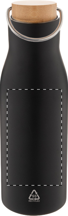 Doppelwandige, vakuumisolierte Flasche aus recyceltem Edelstahl mit Tragedeckel aus Bambus. Füllmenge: 500 ml.