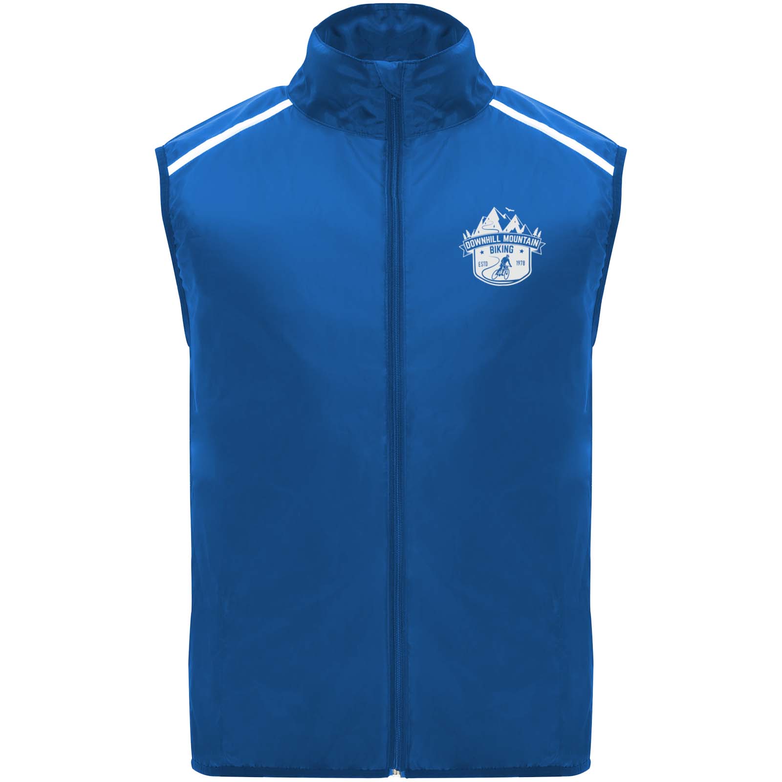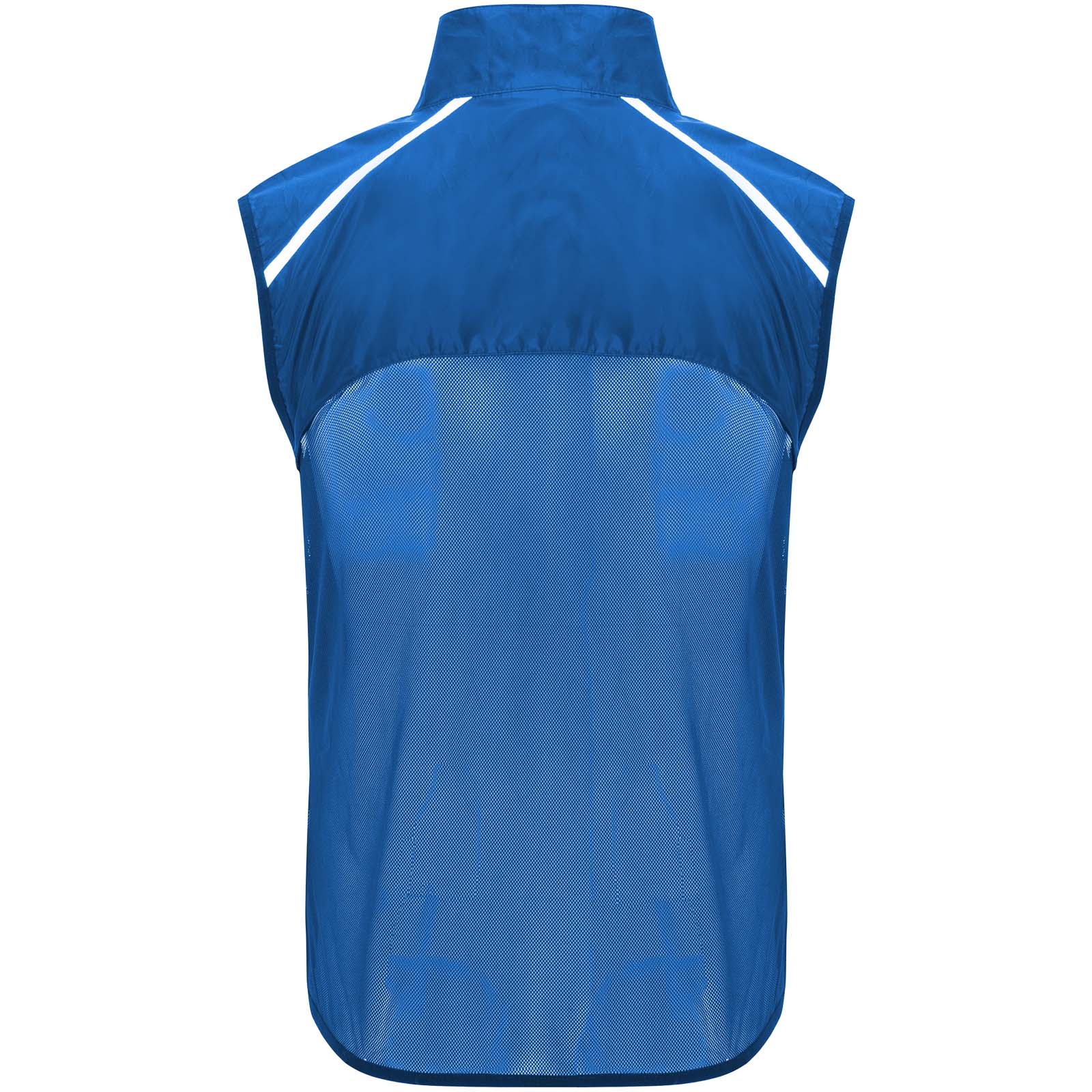 Leichte Funktions - Laufweste, winddicht und atmungsaktiv. Frontreißverschluss mit passendem Kinnschutz. Elastische Einfassung am Armausschnitt und Saum. Untere Rückenpartie aus mikroperforiertem Stoff. Reflektierende Details auf den Schultern, Front- und Rückseite. Tasche mit elastischem Band zum Verstauen der Weste und zum Tragen am Handgelenk. Abnehmbares Etikett.