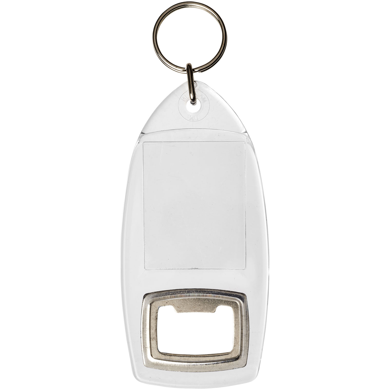Transparenter R1-Schlüsselanhänger mit Flaschenöffner und metallenem Schlüsselring. Der Metallring bietet ein flaches Profil, das sich ideal für Mailings eignet. Abmessungen der Druckeinlage: 4,0 cm x 3,2 cm.