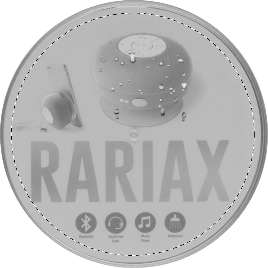 Bluetooth-Lautsprecher mit gummierter Oberfläche, großem Saugnapf, IPX4-Spritzwasserschutz, Freisprechfunktion und Akku. Inkl. USB-Ladekabel.