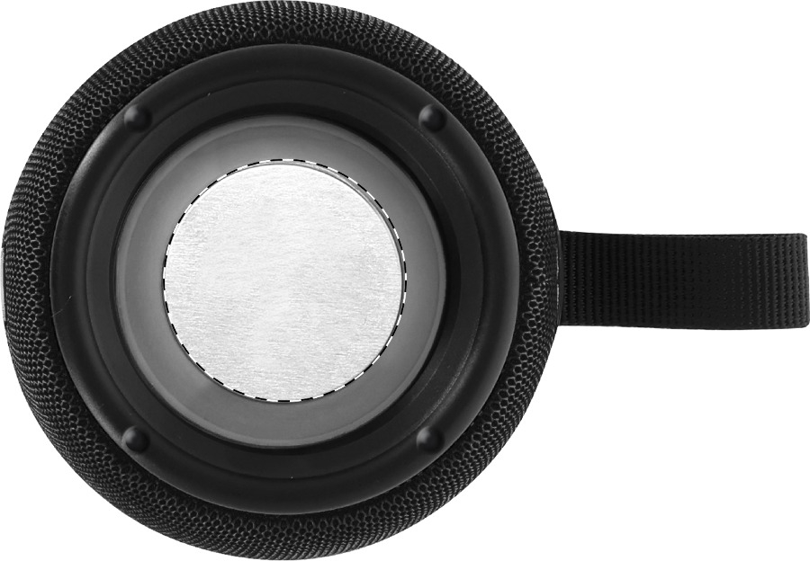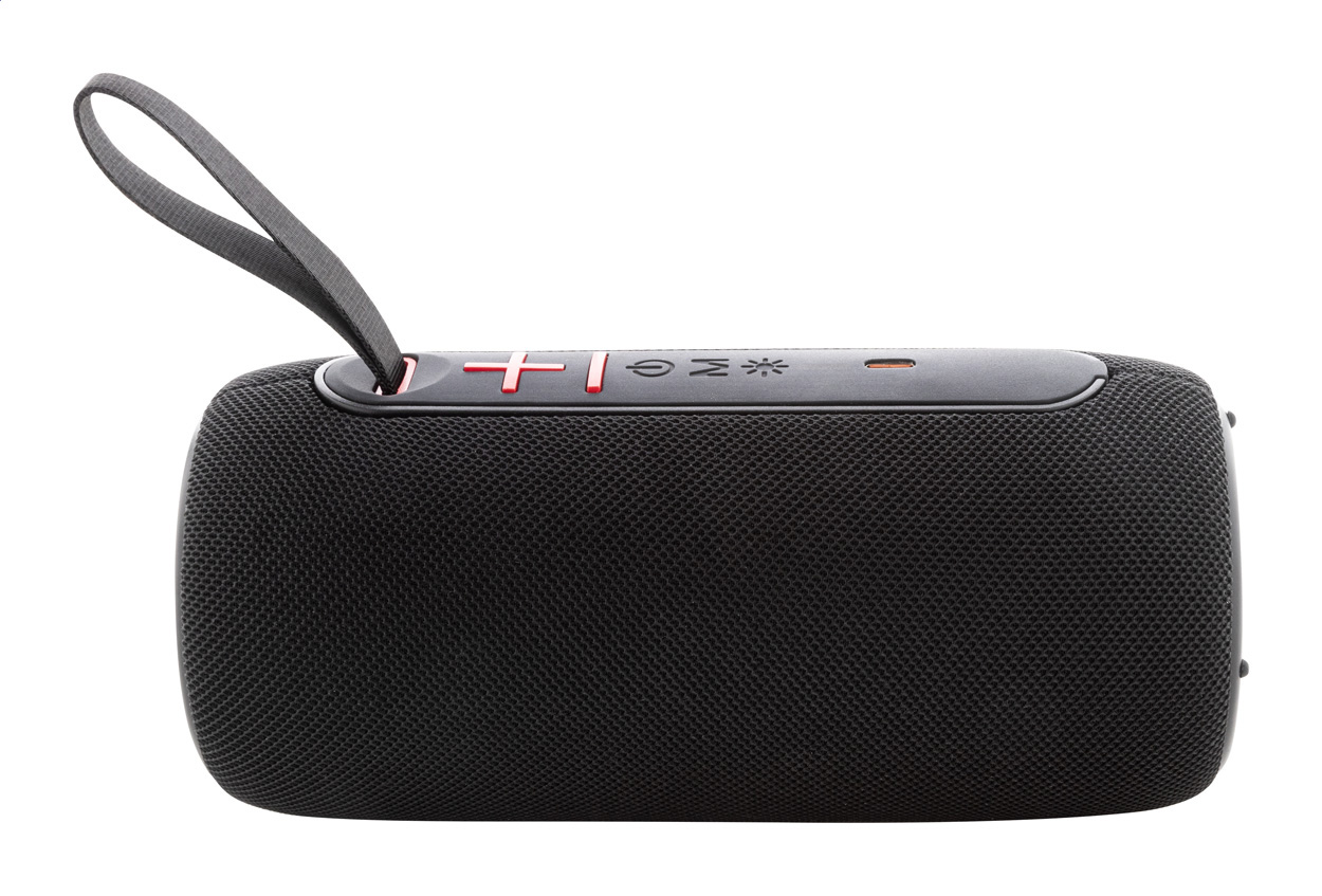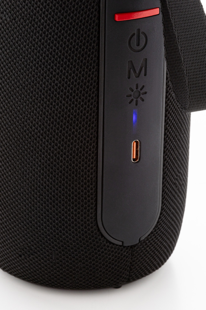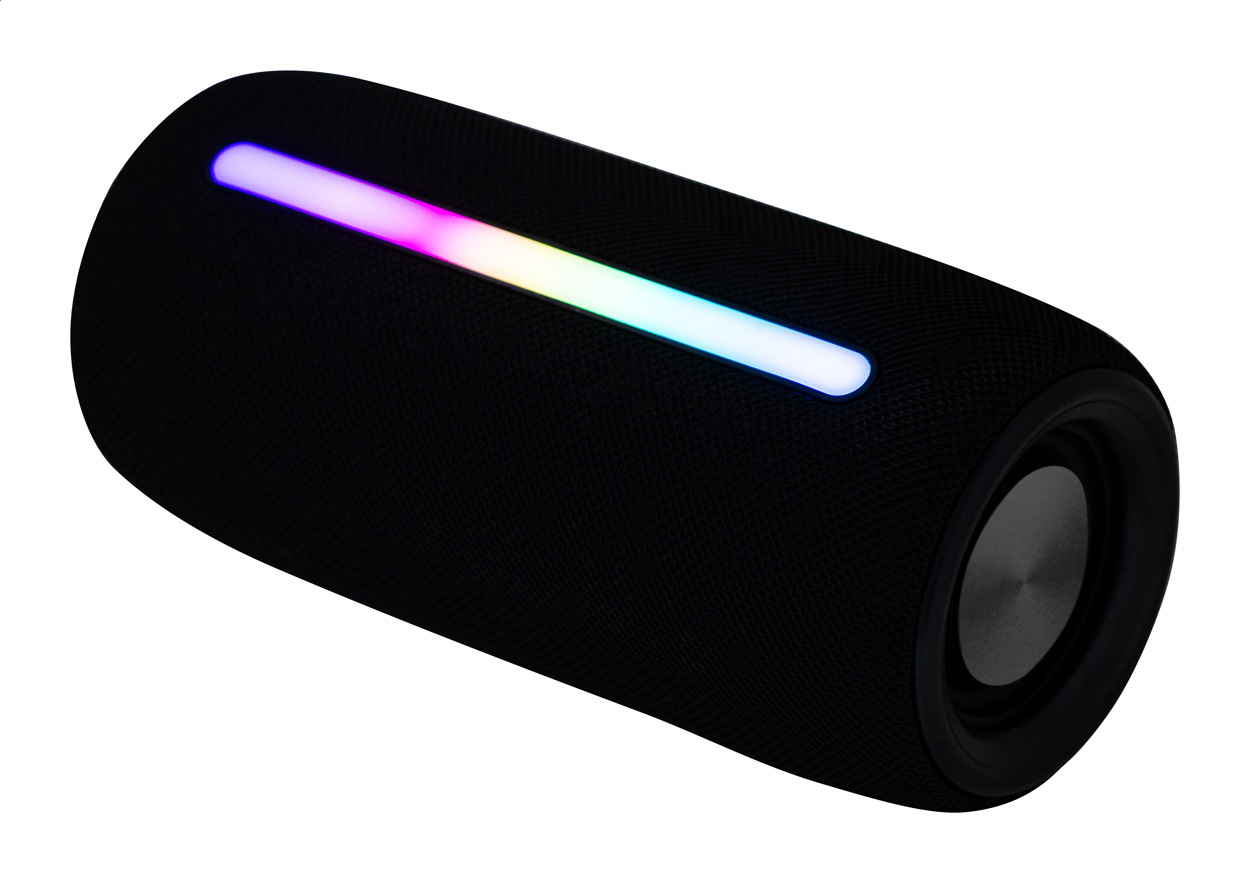 Kabelloser Lautsprecher mit Polyester-Stoffbezug, mehrfarbigem LED-Licht und Tragegurt. Mit 2 Lautsprechertreibern, Freisprechfunktion und eingebautem Akku (1200 mAh). Inklusive USB-Ladekabel.