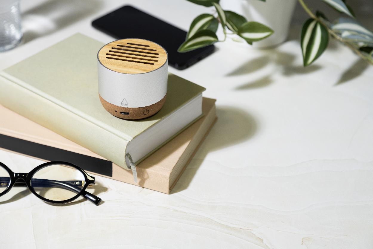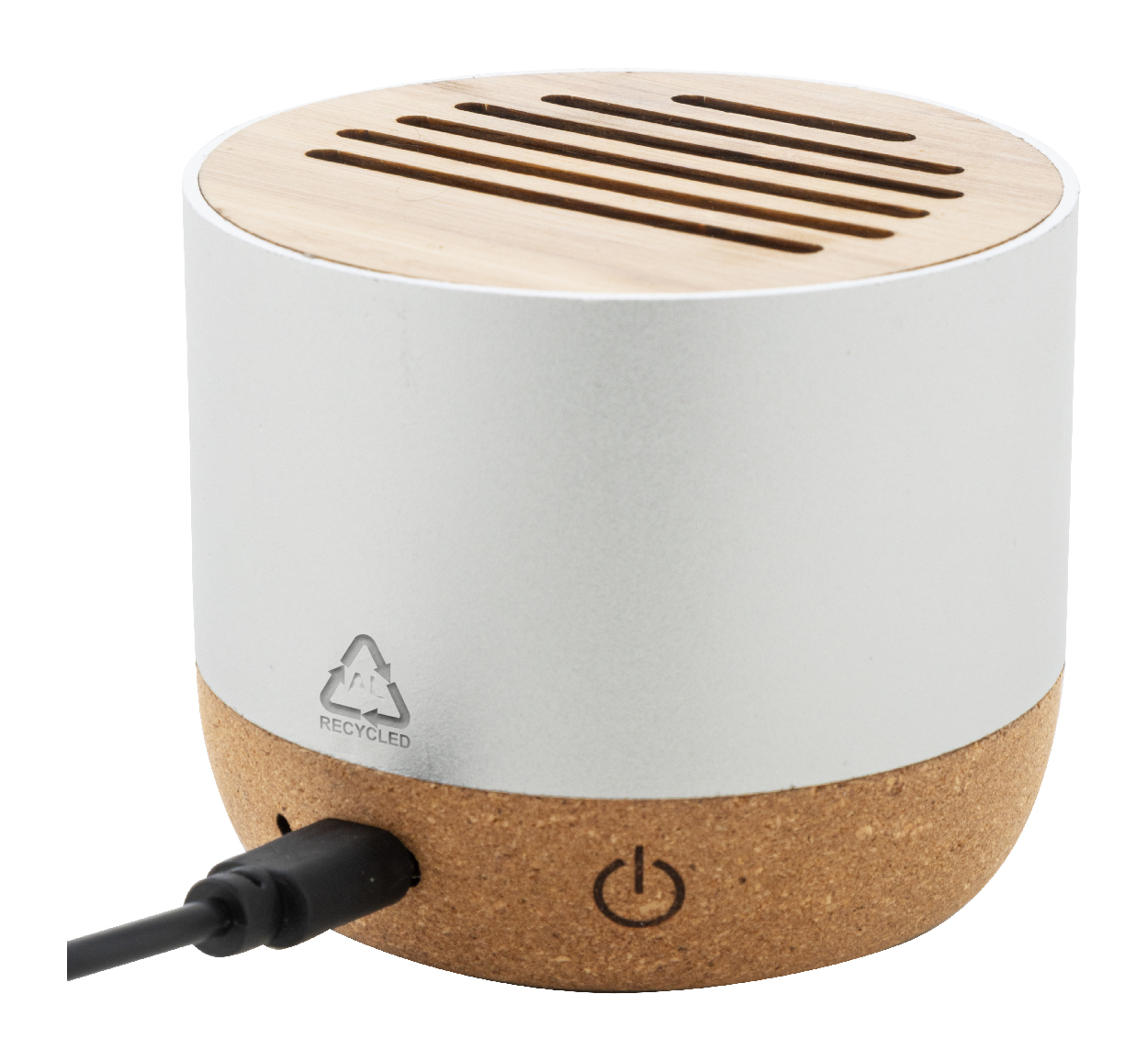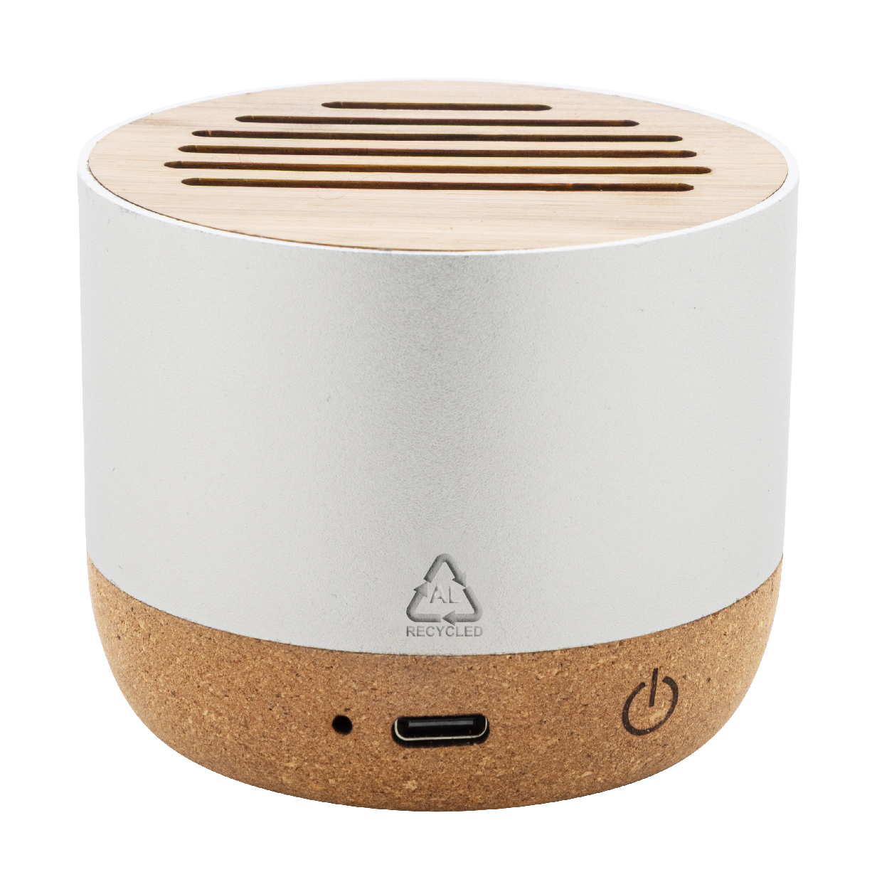 Kabelloser Lautsprecher, Gehäuse aus recyceltem Aluminium mit Bambusgitter und Sockel aus Naturkork. Mit wiederaufladbarem Akku (400 mAh). Inklusive USB-Ladekabel.