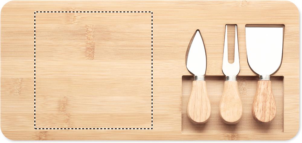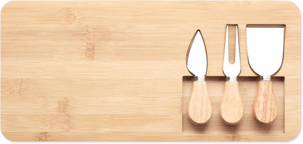 Käse-Set aus Bambus mit Servierbrett, 2 Käsemessern und Käsegabel. Bambus ist ein natürliches Produkt, es kann daher zu leichten Abweichungen in Farbe, Dekor und Maßen kommen.