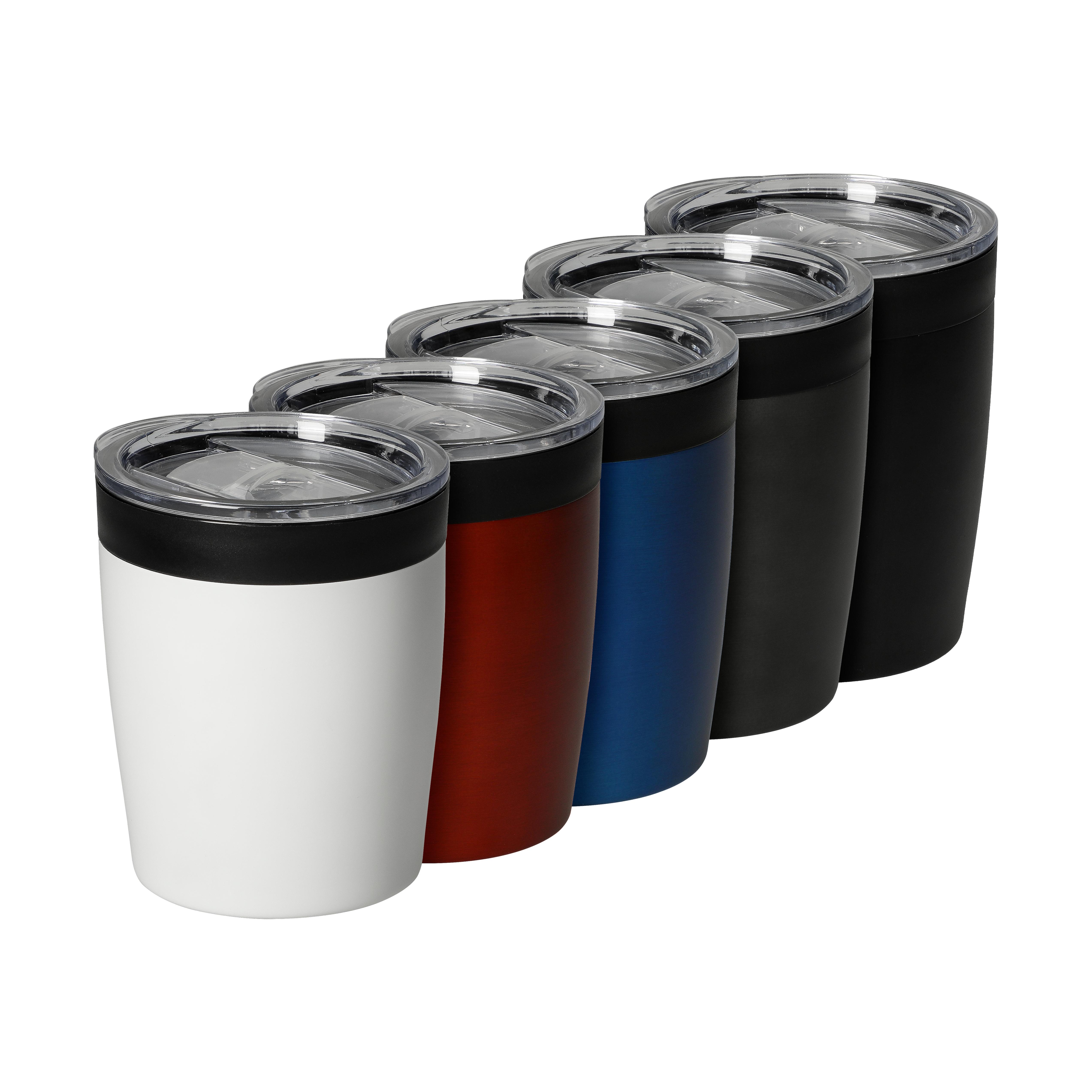 Der passt immer. Doppelwandiger Kaffeebecher, der unter fast jede Kaffeemaschine und in fast jeden gängigen Getränkehalter im PKW passt. Außen aus Edelstahl und innen aus Kunststoff hält er durch die integrierte Silikondichtung im Deckel das Getränk dort wo es bleiben soll. Die Nase am Deckel ermöglicht ein einfaches Öffnen. Füllmenge: 0,28 Liter.