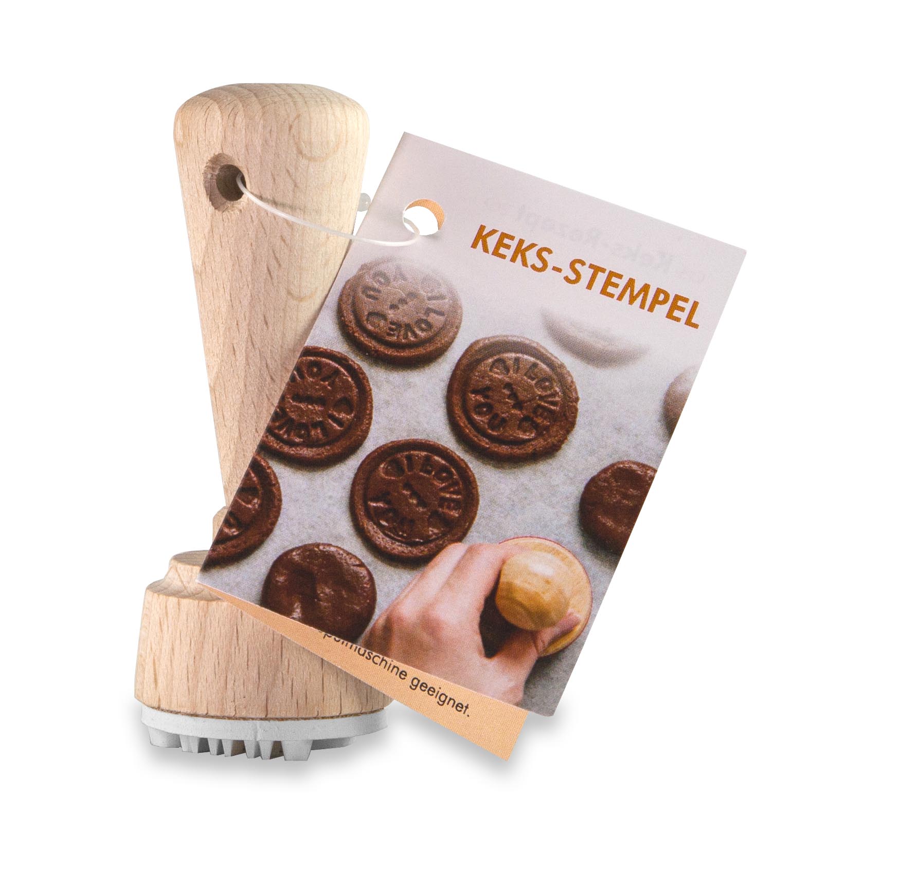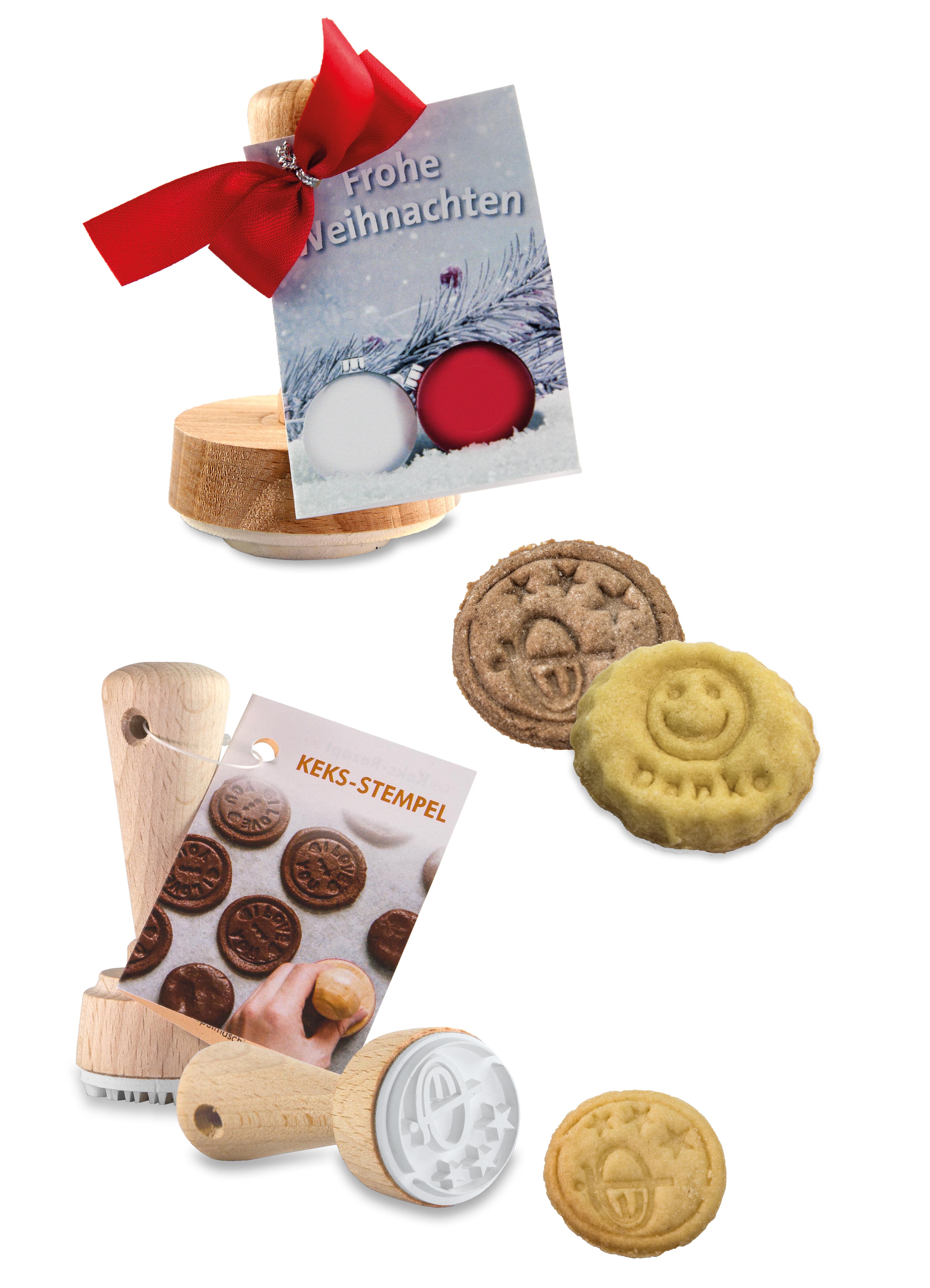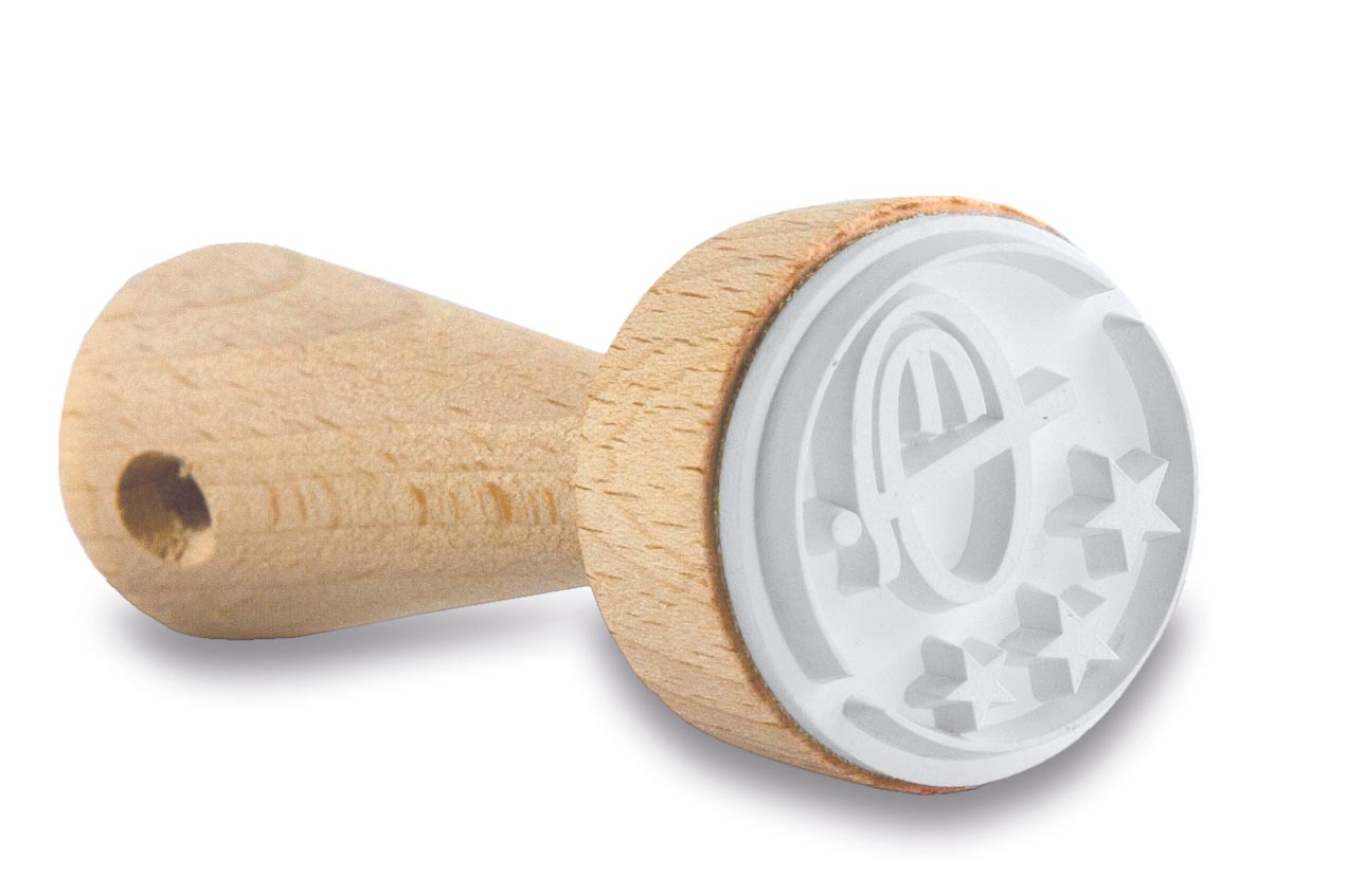 Individueller, gleichbleibender, lebensmittelechter Gummistempel. Holzgriff, deutsche Buche unbehandelt. Standardmaß 35 mm und 55 mm, alle weiteren Größen und Formen auf Anfrage. Ab 100 Stück außen bedruckbare Werbekarte, innen auf Wunsch ein Backrezept. Kombinierbar mit passendem, rundem Backförmchen aus Edelstahl (spülmaschinenfest).