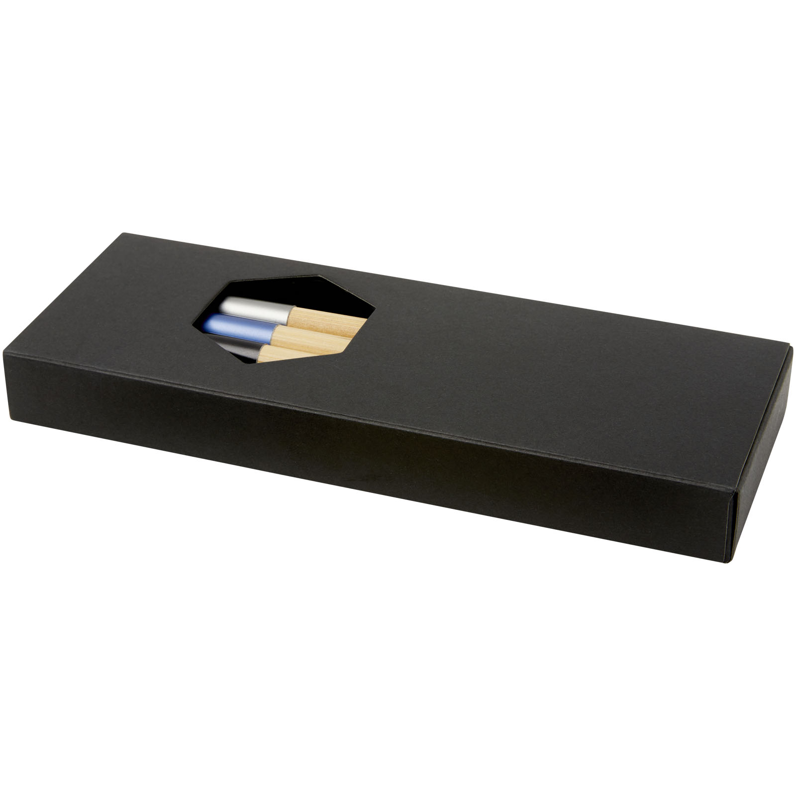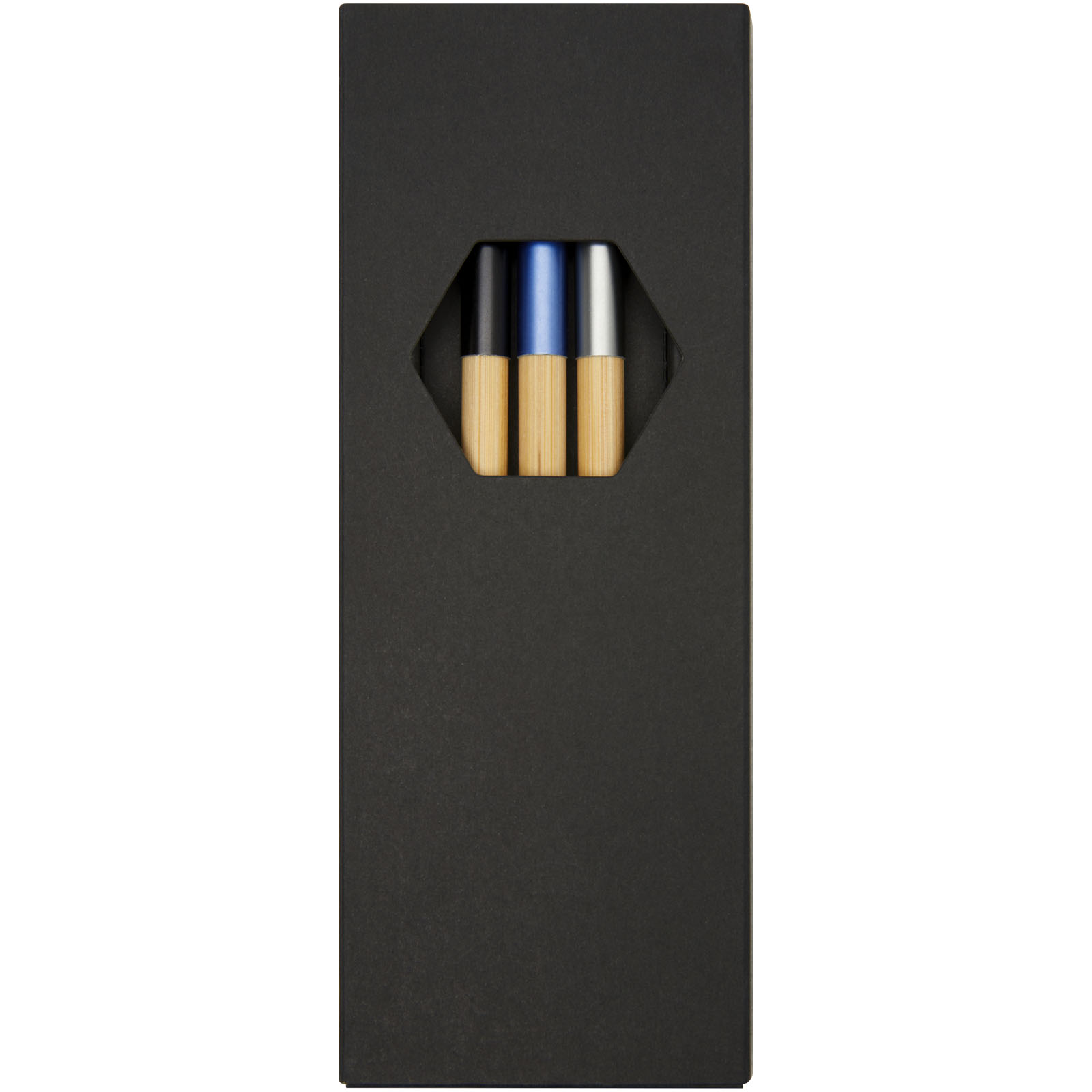 Kugelschreiberset mit exklusivem Design, bestehend aus drei Kugelschreibern mit Farbakzent. Der Kugelschreiber mit der blauen Aluminiumplatte ist mit einer blauen Mine bestückt, während die beiden anderen Stifte mit einer schwarzen Mine bestückt sind. Verpackt in einer schwarzen Geschenkbox.