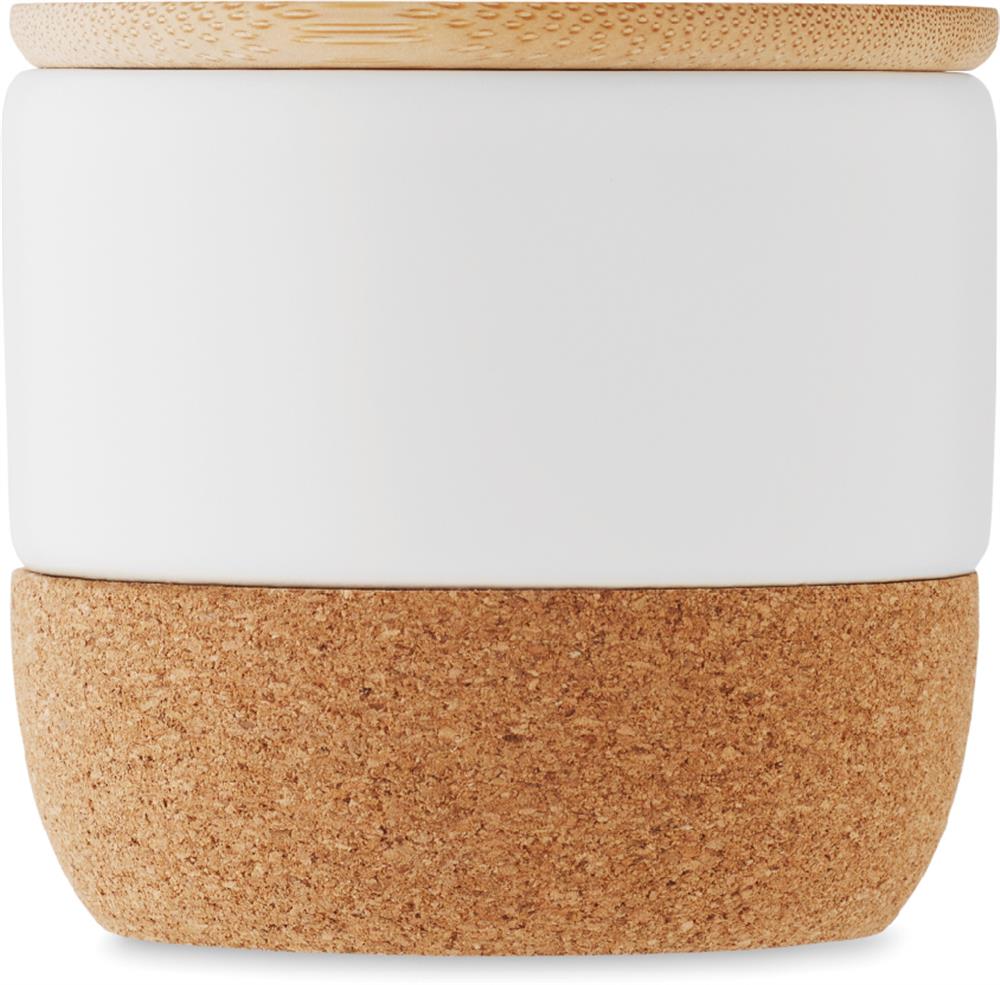 Kerze im Halter aus Steingut. Deckel aus Bambus und Korkboden. Wachs auf pflanzlicher Basis. Aroma: Frische Wäsche. 80 g. Brenndauer: 7,5 Stunden. Bambus ist ein natürliches Produkt, es kann daher zu leichten Abweichungen in Farbe, Dekor und Maßen kommen.