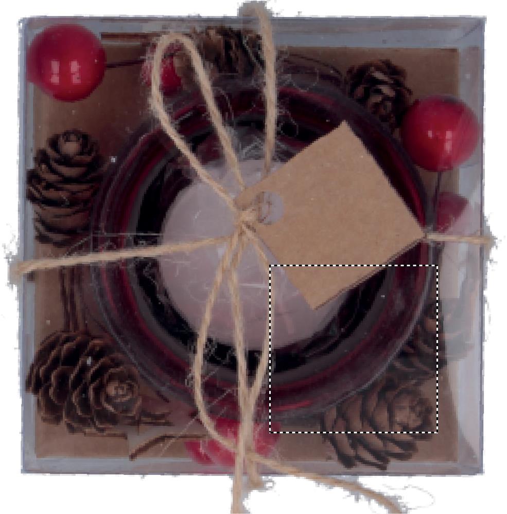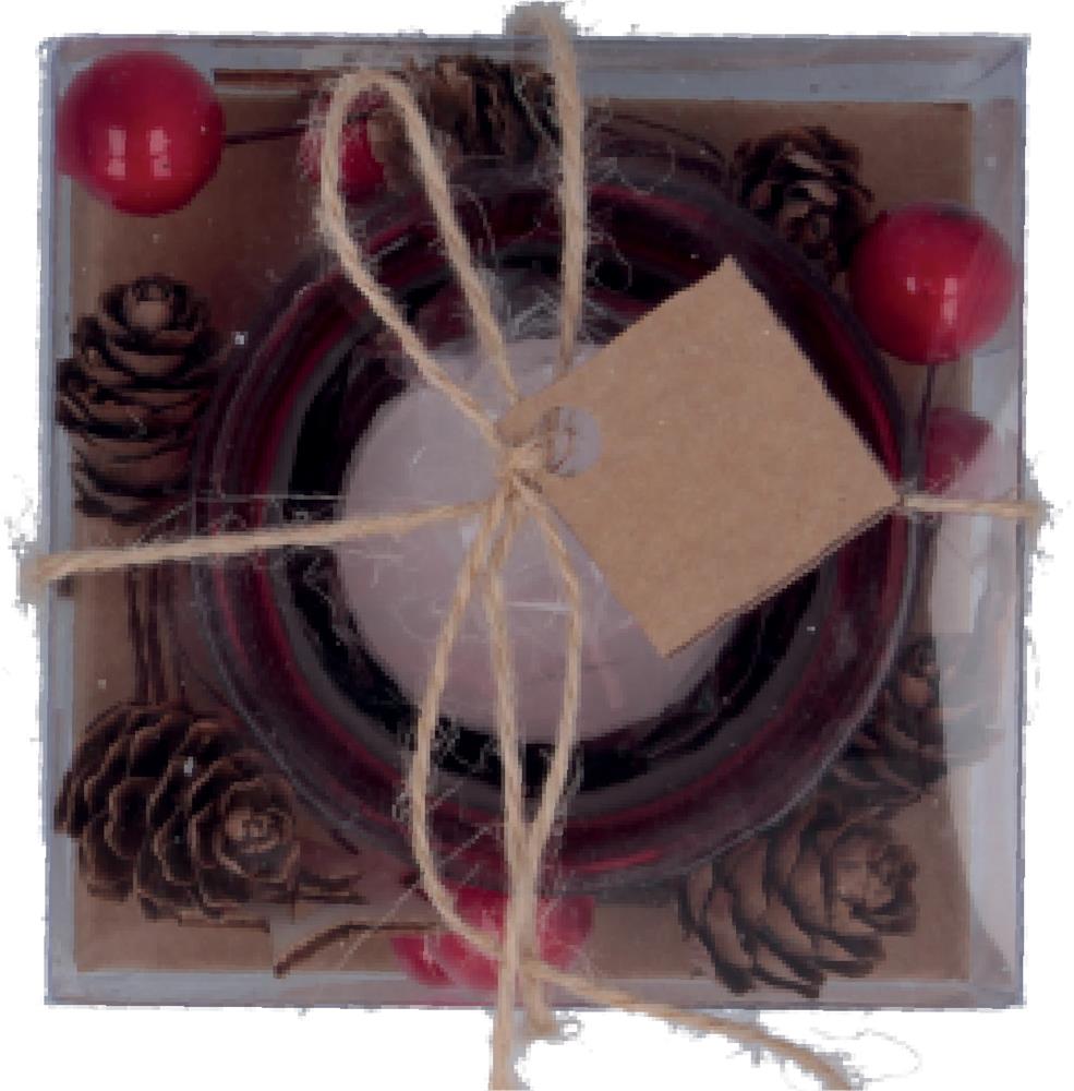 Kerzenhalter aus Glas mit weihnachtlicher Dekoration. Verpackt in einer PVC/Karton Box mit Band und Anhänger.