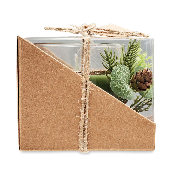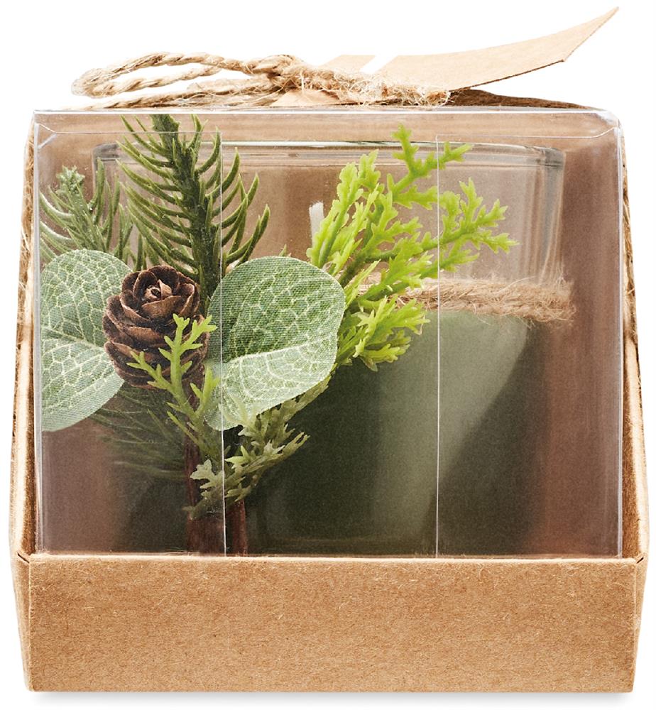 Kerzenhalter aus Glas (120 g) mit Tannen-Dekor. Lieferung in einem Display-Karton mit Jutekordel und Geschenkanhänger aus Kraftpapier. Inkl. 1 Kerze.