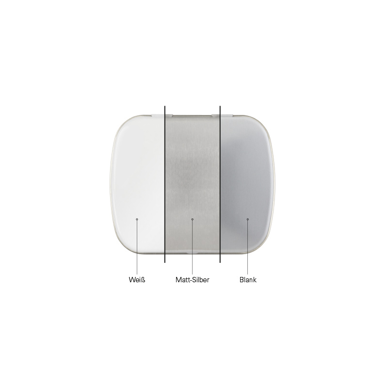 Scharnierdeckeldose mit gewölbtem Deckel, blank aus Metall, individuell bedruckt. Mit Originalitätsverschluss und Aufreißperforation, Weißblech 98% recycelbar. Inhalt: Traubenzuckerquadrate mit Fruchtgeschmack, 18 g