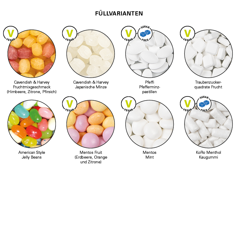 Mini Bonbons im Bonbonglas mit Deckel und Papieretikett auf dem Deckel, individuell bedruckt. Inhalt: Cavendish & Harvey Mini Bonbons Fruchtmix (Himbeere, Zitrone und Pfirsich), 30 gMengeneinheit: St.Füllung: Cavendish & Harvey Mini Bonbons FruchtmixFarbe: weißSorten: Himbeere, Zitrone, Pfirsich - gemischtMindesthaltbarkeit: 24 MonateMaterial: Bonbonglas