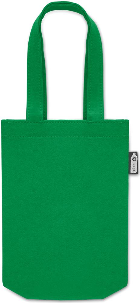 Kleine Geschenk- oder Goodie-Tasche mit kurzen Tragegriffen und Bodenfalte aus RPET-Filz. Filzstärke: 1 mm.