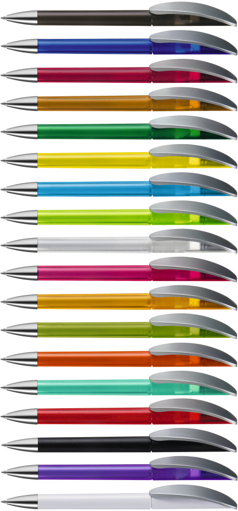 Drehkugelschreiber mit transparent gefrostetem oder gedeckt mattem Gehäuse, Bogenclip silber matt und schwerer Metallspitze matt verchromt.Druckbereich: Auf dem Clip 38mm x 8mm Tampondruck (T), in Clipverlängerung 45mm x 20mm Siebdruck (S), gegenüber vom Clip 45mm x 20mm Siebdruck (S), seitlich vom Clip 45mm x 20mm Siebdruck (S)