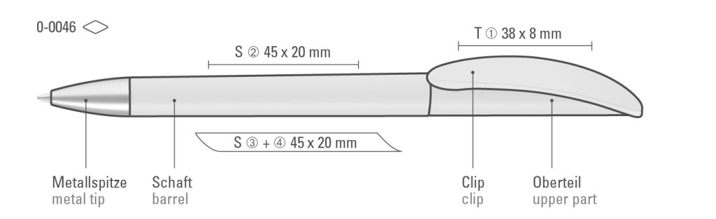 Druckbereich: Auf dem Clip 38mm x 8mm Tampondruck (T), in Clipverlängerung 45mm x 20mm Siebdruck (S), gegenüber vom Clip 45mm x 20mm Siebdruck (S), seitlich vom Clip 45mm x 20mm Siebdruck (S)