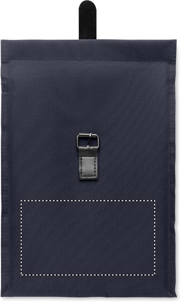 Lunch-Kühltasche aus 600D RPET-Polyester mit Rolltop. Tragegriff und Verschluss aus PU. Isolierung: 3mm PE-Schaum mit PEVA.