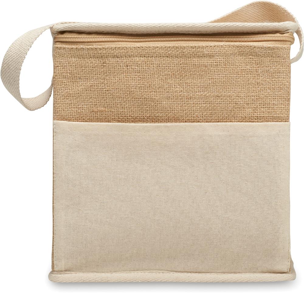 Kühltasche aus Jute mit Fronttasche und Gurt aus Baumwolle. Platz für 6 x 0,5L Flaschen. Isoliermaterial: 3 mm Aluminiumfolie. Füllmenge: 3L.