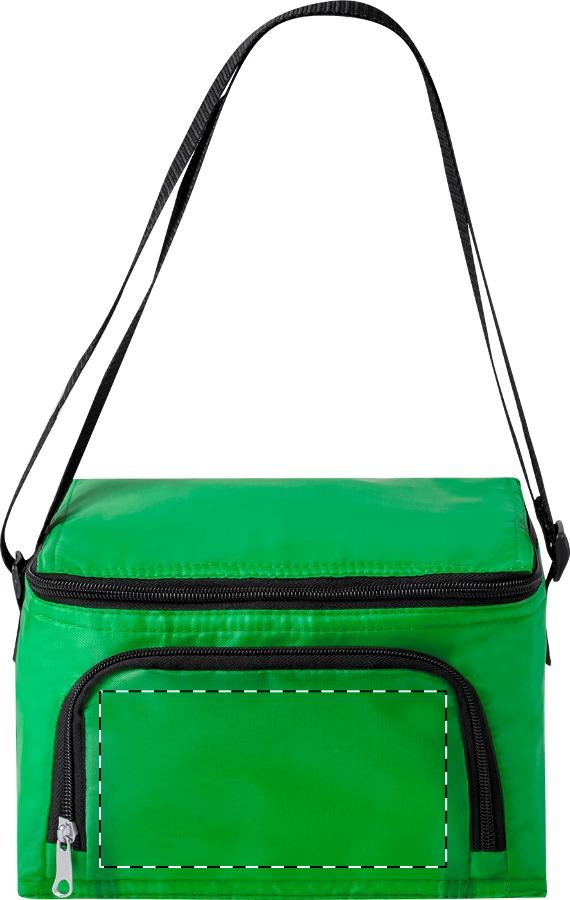 Kühltasche aus Polyester mit Reißverschlussfächern, Aluminiumpolsterung und Schultergurt. Für 6 Dosen á 0,33 L. Material: 210D Polyester.