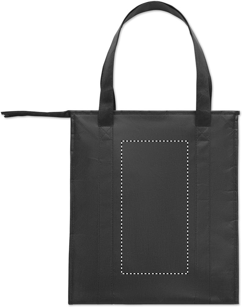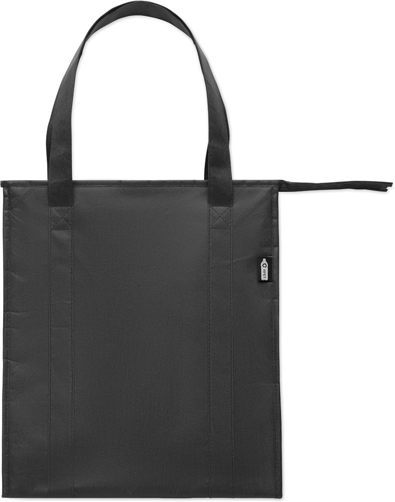 Kühltasche aus RPET-Non Woven 80g/m². Hauptfach mit Reißverschluss, herausnehmbare PP Verstärkung im Boden. Isoliermaterial: Aluminiumfolie. Füllmenge: 25L.