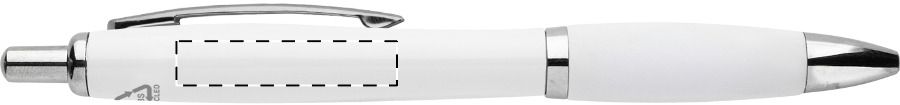 Weißer Kunststoff-Kugelschreiber mit farbigem Clip, blauschreibend.Maße: ø10×138 mmSchreibgerät-Typ: KugelschreiberSchreibgerät-Mechanik: DruckmechanikSchreibfarbe: BlauMinentyp: Normale MineLinienstärke: 1 mmMaterial: Kunststoff (ABS)Veredelungsposition 1: Korpus - rechts vom ClipTechnologie: UV-LED-Druck - EinzelnamenDurchmesser: 0Druckcode: NUVATechnologie: TampondruckMaximale Farben: 4Durchmesser: 0Druckcode: P0Technologie: TampondruckMaximale Farben: 1Durchmesser: 0Druckcode: P1Technologie: UV LED DruckDurchmesser: 0Druckcode: UVAVeredelungsposition 2: Korpus - links vom ClipTechnologie: UV-LED-Druck - EinzelnamenDurchmesser: 0Druckcode: NUVATechnologie: TampondruckMaximale Farben: 4Durchmesser: 0Druckcode: P0Technologie: TampondruckMaximale Farben: 1Durchmesser: 0Druckcode: P1Technologie: UV LED DruckDurchmesser: 0Druckcode: UVAVeredelungsposition 3: KlipTechnologie: TampondruckMaximale Farben: 4Durchmesser: 0Druckcode: P0Veredelungsposition 4: Korpus - in Verlängerung vom ClipTechnologie: TampondruckMaximale Farben: 4Durchmesser: 0Druckcode: P0