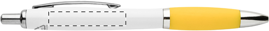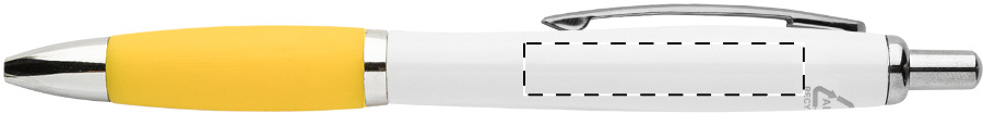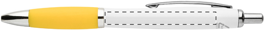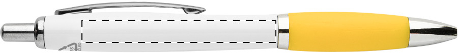 Weißer Kunststoff-Kugelschreiber mit farbigem Clip, blauschreibend.Maße: ø10×138 mmSchreibgerät-Typ: KugelschreiberSchreibgerät-Mechanik: DruckmechanikSchreibfarbe: BlauMinentyp: Normale MineLinienstärke: 1 mmMaterial: Kunststoff (ABS)Veredelungsposition 1: Korpus - rechts vom ClipTechnologie: UV-LED-Druck - EinzelnamenDurchmesser: 0Druckcode: NUVATechnologie: TampondruckMaximale Farben: 4Durchmesser: 0Druckcode: P0Technologie: TampondruckMaximale Farben: 1Durchmesser: 0Druckcode: P1Technologie: UV LED DruckDurchmesser: 0Druckcode: UVAVeredelungsposition 2: Korpus - links vom ClipTechnologie: UV-LED-Druck - EinzelnamenDurchmesser: 0Druckcode: NUVATechnologie: TampondruckMaximale Farben: 4Durchmesser: 0Druckcode: P0Technologie: TampondruckMaximale Farben: 1Durchmesser: 0Druckcode: P1Technologie: UV LED DruckDurchmesser: 0Druckcode: UVAVeredelungsposition 3: KlipTechnologie: TampondruckMaximale Farben: 4Durchmesser: 0Druckcode: P0Veredelungsposition 4: Korpus - in Verlängerung vom ClipTechnologie: TampondruckMaximale Farben: 4Durchmesser: 0Druckcode: P0