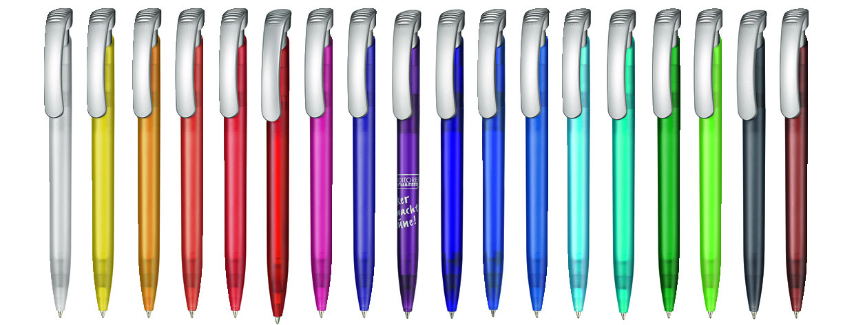 Drehkugelschreiber mit gefrostetem Gehäuse, Clip und Stopfen im Oberteil gedeckt glänzend bzw. transparent glänzend. Schwere Metallspitze glanzverchromt. BlackForestPen Designed in Deutschland, gefertigt in der Schweiz, zusammengefügt und veredelt im Schwarzwald.Druckbereich: Auf dem Clip 40mm x 7mm Tampondruck (T), in Clipverlängerung 50mm x 20mm Siebdruck (S), gegenüber vom Clip 50mm x 20mm Siebdruck (S), seitlich vom Clip 50mm x 20mm Siebdruck (S), auf der Kappe/auf dem Oberteil 30mm x 7mm Tampondruck (T), seitliche Clipbefestigung 8mm x 8mm Tampondruck (T)