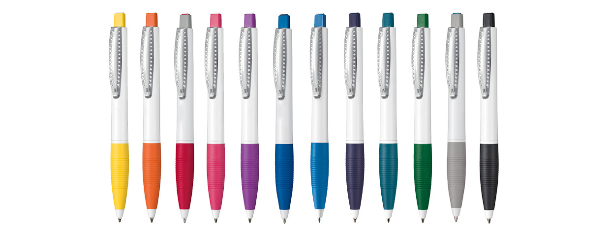 Weißer Kunststoff-Kugelschreiber mit farbigem Clip, blauschreibend.Maße: ø10×138 mmSchreibgerät-Typ: KugelschreiberSchreibgerät-Mechanik: DruckmechanikSchreibfarbe: BlauMinentyp: Normale MineLinienstärke: 1 mmMaterial: Kunststoff (ABS)Veredelungsposition 1: Korpus - rechts vom ClipTechnologie: UV-LED-Druck - EinzelnamenDurchmesser: 0Druckcode: NUVATechnologie: TampondruckMaximale Farben: 4Durchmesser: 0Druckcode: P0Technologie: TampondruckMaximale Farben: 1Durchmesser: 0Druckcode: P1Technologie: UV LED DruckDurchmesser: 0Druckcode: UVAVeredelungsposition 2: Korpus - links vom ClipTechnologie: UV-LED-Druck - EinzelnamenDurchmesser: 0Druckcode: NUVATechnologie: TampondruckMaximale Farben: 4Durchmesser: 0Druckcode: P0Technologie: TampondruckMaximale Farben: 1Durchmesser: 0Druckcode: P1Technologie: UV LED DruckDurchmesser: 0Druckcode: UVAVeredelungsposition 3: KlipTechnologie: TampondruckMaximale Farben: 4Durchmesser: 0Druckcode: P0Veredelungsposition 4: Korpus - in Verlängerung vom ClipTechnologie: TampondruckMaximale Farben: 4Durchmesser: 0Druckcode: P0