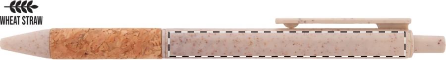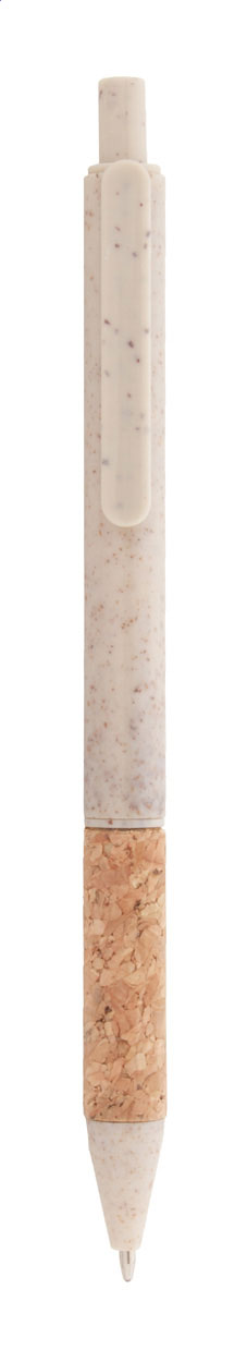 Kugelschreiber aus ökologischem Weizenstrohkunststoff mit Griffzone aus natürlichem Kork und farbigen Elementen, blauschreibend.