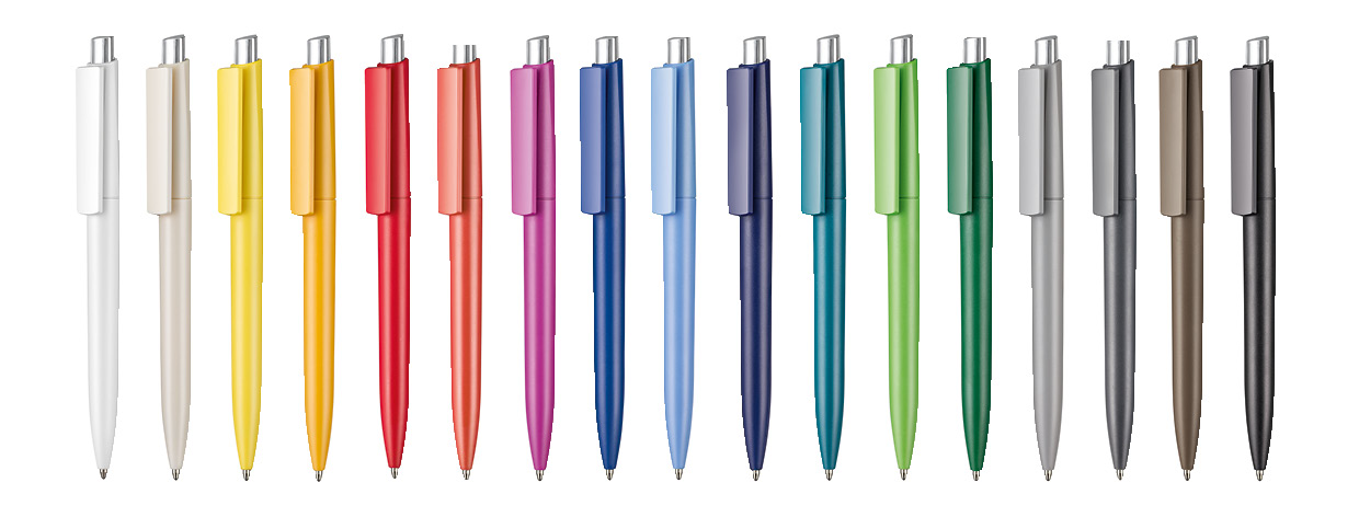 Eine ausgeklügelte Formensprache kennzeichnet diesen in Deutschland hergestellten Druckkugelschreiber. Das matte Gehäuse harmoniert mit dem glänzenden Clip und Drücker. Von der Spitze her zum Drücker verändert sich der Schaft von rund in eine interessante Dreikantform. Schaft und Clip bieten ausreichend große Druckflächen für Ihre Werbung. Ausgestattet ist dieses Schreibgerät mit einer weich schreibenden Qualitätsmine JOGGER. Lieferbar außerdem mit Gelmine.