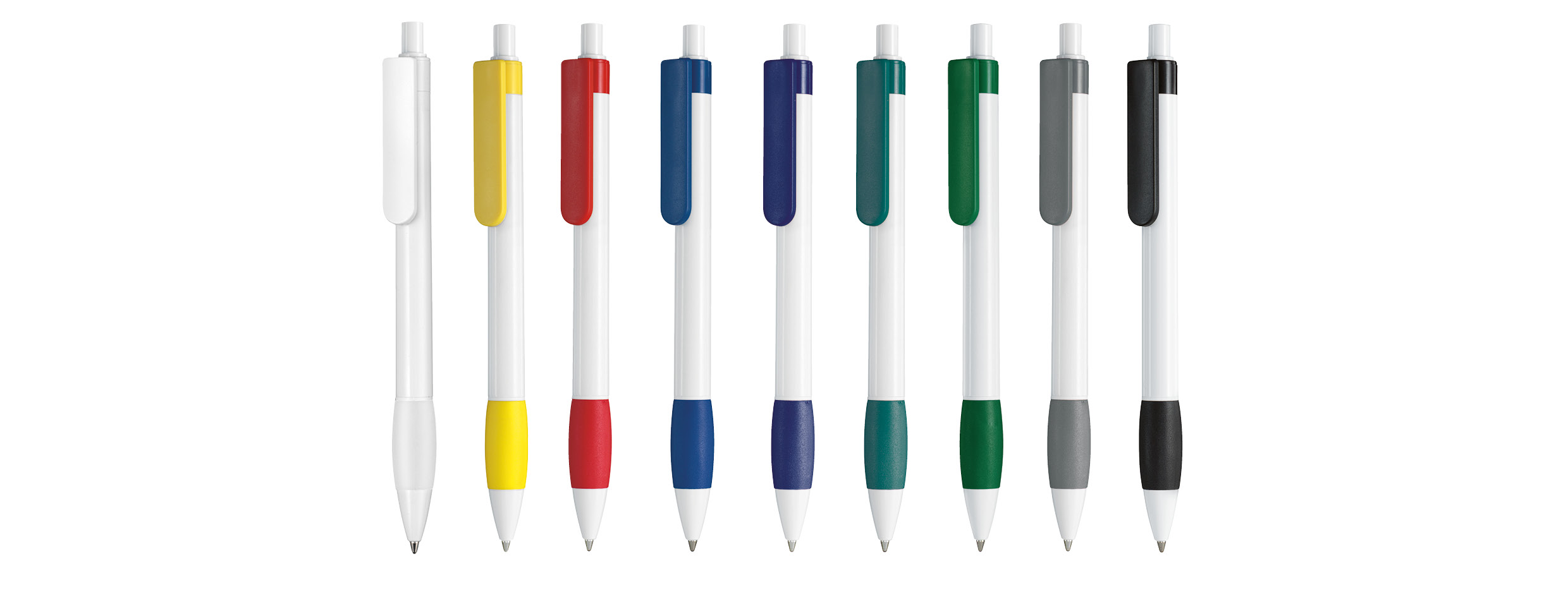 Weißer Kunststoff-Kugelschreiber mit farbigem Clip, blauschreibend.Maße: ø10×138 mmSchreibgerät-Typ: KugelschreiberSchreibgerät-Mechanik: DruckmechanikSchreibfarbe: BlauMinentyp: Normale MineLinienstärke: 1 mmMaterial: Kunststoff (ABS)Veredelungsposition 1: Korpus - rechts vom ClipTechnologie: UV-LED-Druck - EinzelnamenDurchmesser: 0Druckcode: NUVATechnologie: TampondruckMaximale Farben: 4Durchmesser: 0Druckcode: P0Technologie: TampondruckMaximale Farben: 1Durchmesser: 0Druckcode: P1Technologie: UV LED DruckDurchmesser: 0Druckcode: UVAVeredelungsposition 2: Korpus - links vom ClipTechnologie: UV-LED-Druck - EinzelnamenDurchmesser: 0Druckcode: NUVATechnologie: TampondruckMaximale Farben: 4Durchmesser: 0Druckcode: P0Technologie: TampondruckMaximale Farben: 1Durchmesser: 0Druckcode: P1Technologie: UV LED DruckDurchmesser: 0Druckcode: UVAVeredelungsposition 3: KlipTechnologie: TampondruckMaximale Farben: 4Durchmesser: 0Druckcode: P0Veredelungsposition 4: Korpus - in Verlängerung vom ClipTechnologie: TampondruckMaximale Farben: 4Durchmesser: 0Druckcode: P0