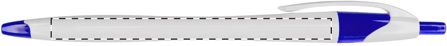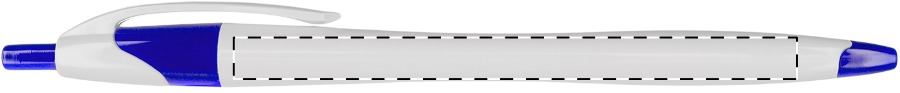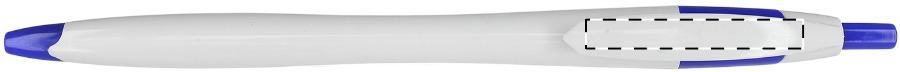 Weißer Kunststoff-Kugelschreiber mit farbigem Clip, blauschreibend.Maße: ø10×138 mmSchreibgerät-Typ: KugelschreiberSchreibgerät-Mechanik: DruckmechanikSchreibfarbe: BlauMinentyp: Normale MineLinienstärke: 1 mmMaterial: Kunststoff (ABS)Veredelungsposition 1: Korpus - rechts vom ClipTechnologie: UV-LED-Druck - EinzelnamenDurchmesser: 0Druckcode: NUVATechnologie: TampondruckMaximale Farben: 4Durchmesser: 0Druckcode: P0Technologie: TampondruckMaximale Farben: 1Durchmesser: 0Druckcode: P1Technologie: UV LED DruckDurchmesser: 0Druckcode: UVAVeredelungsposition 2: Korpus - links vom ClipTechnologie: UV-LED-Druck - EinzelnamenDurchmesser: 0Druckcode: NUVATechnologie: TampondruckMaximale Farben: 4Durchmesser: 0Druckcode: P0Technologie: TampondruckMaximale Farben: 1Durchmesser: 0Druckcode: P1Technologie: UV LED DruckDurchmesser: 0Druckcode: UVAVeredelungsposition 3: KlipTechnologie: TampondruckMaximale Farben: 4Durchmesser: 0Druckcode: P0Veredelungsposition 4: Korpus - in Verlängerung vom ClipTechnologie: TampondruckMaximale Farben: 4Durchmesser: 0Druckcode: P0